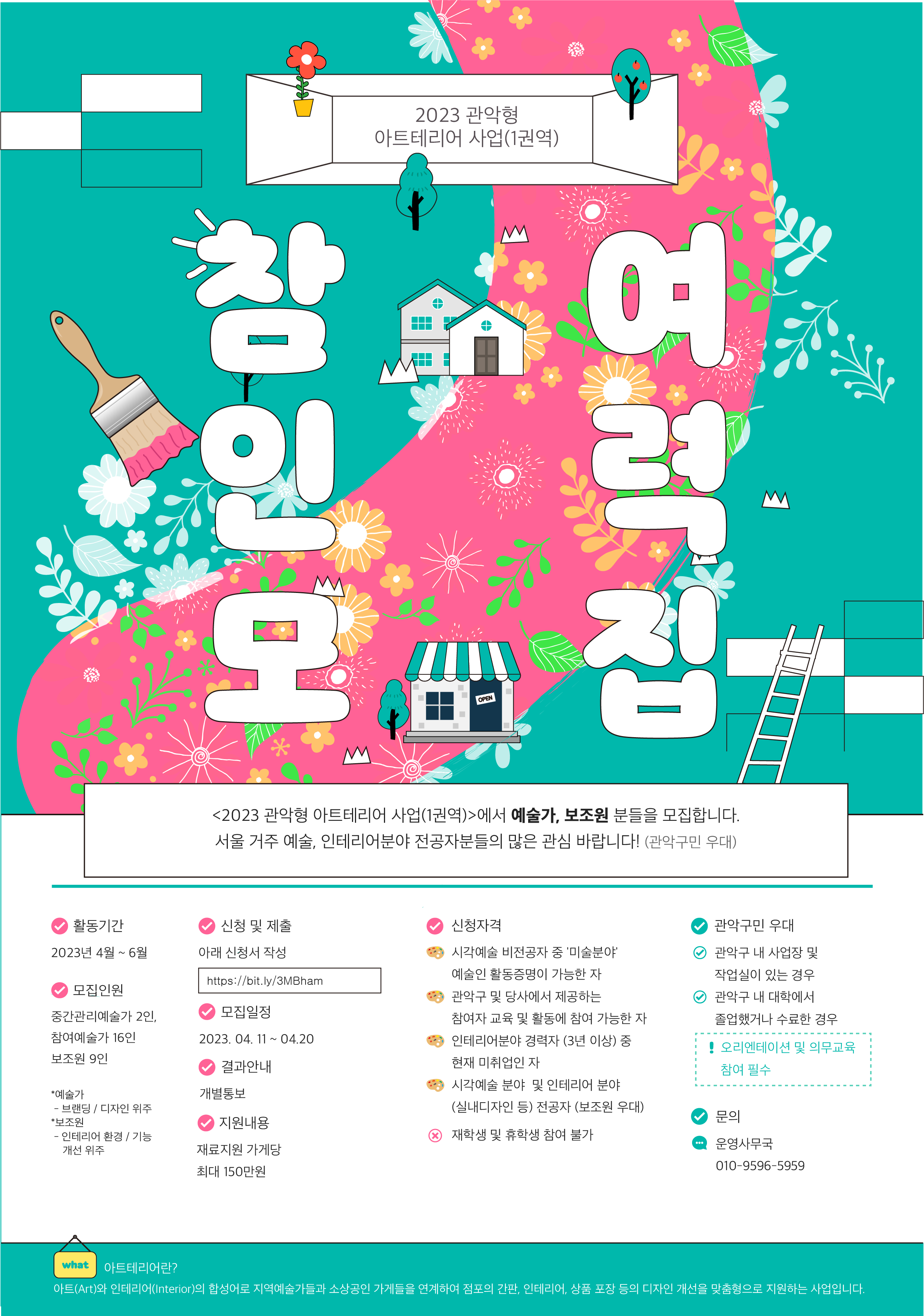 <2023 관악형 아트테리어 사업>에서 참여인력 분들을 모집합니다. ✔ 서울 거주 예술분야 전공자분들의 많은 관심 바랍니다! (관악구민 우대) ◼ 활동기간 : 2023년 4월 ~ 6월 ◼ 모집인원 : 중간관리예술가 2인, 지역예술가 16인, 보조원 9인 ◼ 지원내용 : 재료지원 가게당 최대 150만원 ◼ 신청 및 제출 - 첨부파일 및 구글폼 작성 - https://bit.ly/3MBhams ◼ 모집일정 : 2022. 04. 11 ~ 04.20 ◼ 결과안내 : 합격자에 한해 개별 연락 ◼ 신청자격 - 시각예술 비전공자 중 '미술분야' 예술인 활동증명이 가능한 자 - 관악구 및 당사에서 제공하는 참여자 교육 및 활동에 참여 가능한 자 - 인테리어분야 경력자 (3년 이상) 중 현재 미취업인 자 (보조원 우대) - 시각예술 분야 및 인테리어 분야(실내디자인 등) 전공자 ※ 재학생 및 휴학생 참여 불가 ◼ 관악구민 우대 - 관악구 내 사업장 및 작업실이 있는 경우 - 관악구 내 대학에서 졸업했거나 수료한 경우 ※ 오리엔테이션 및 의무교육 참여 필수 ※ 1,2권역 중복참여금지 ◼ 문의 : 운영사무국 010-9596-5959 예술가,보조원 분들의 많은 지원 바랍니다. ✔ 아트테리어란? 아트(Art)와 인테리어(Interior)의 합성어로 지역예술가들과 소상공인 가게들을 연계하여 점포의 간판, 인테리어, 상품 포장 등의 디자인 개선을 맞춤형으로 지원하는 사업입니다.