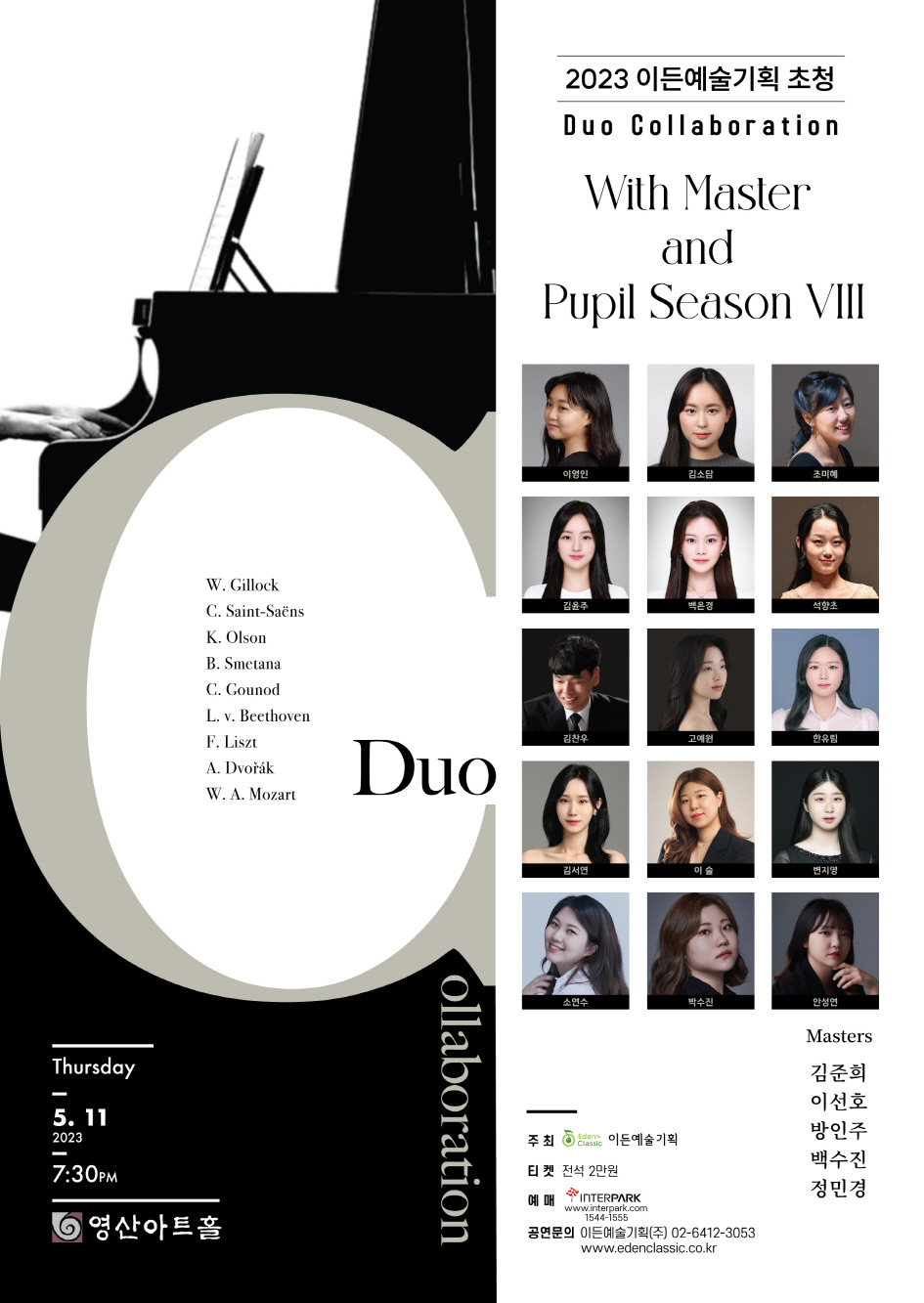 Duo Collaboration은 스승에 대한 존경과 감사와 더불어 제자에 대한 사랑이 담긴 음악회입니다. Duo라는 형식에 Collaboration(‘모두 일하는’, ‘협력하는 것’을 의미)이라는 주제로 대중적으로 친숙한 멜로디의 곡을 선정하여 스승과 제자가 함께 호흡하고, 음악에 대한 공감대를 형성하는 무대를 만들어오고 있으며 그 자체만으로도 화합과 사랑의 의미가 충분히 담겨 있습니다.