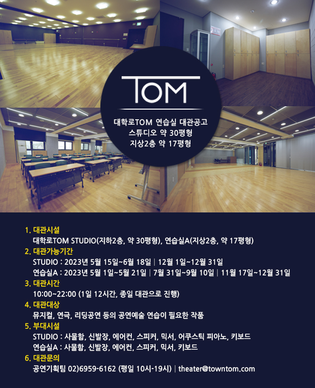 대학로TOM(티오엠) 연습실 대관 공고입니다. 티오엠씨어터는 중·소극장 뮤지컬 및 연극 연습에 적합한 30평형의 지하 연습실과 연극 및 소규모 뮤지컬 연습에 적합한 17평형의 지상 연습실을 운영하고 있습니다.
