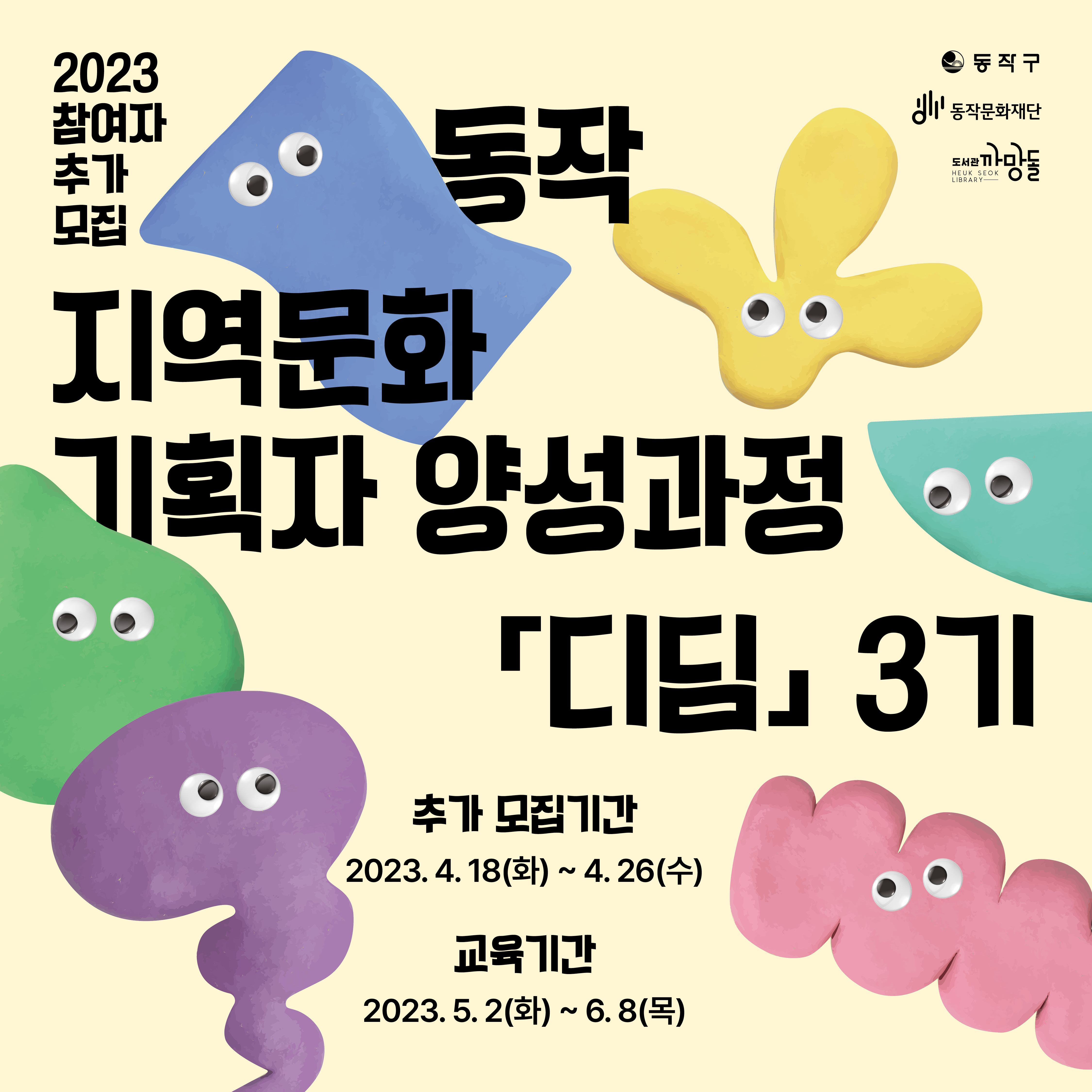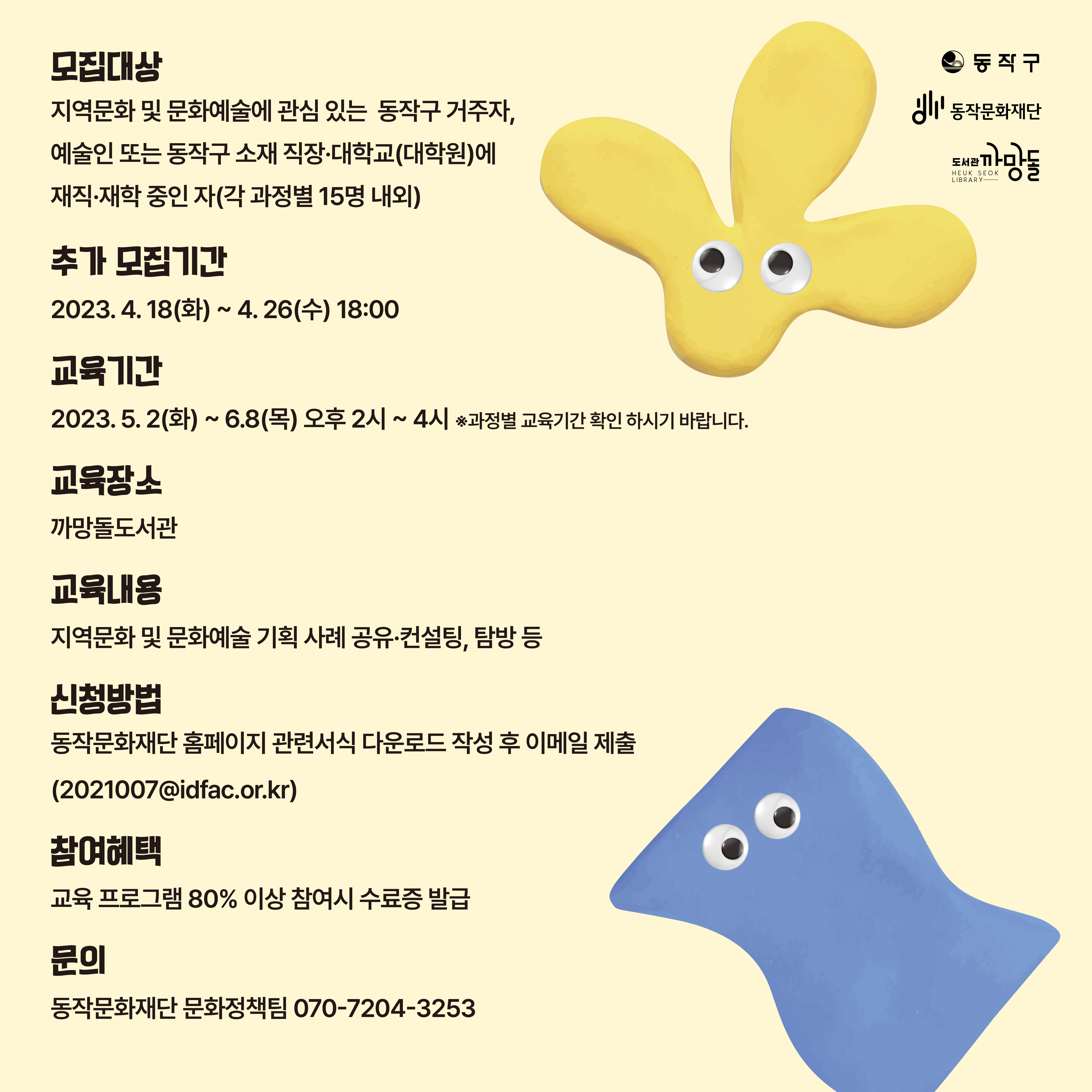 - 교육내용 : 지역문화 및 문화예술 기획 사례 공유, 컨설팅, 탐방 등 - 교육일정 : 5월 2일(화) ~ 6월8일(목) 오후 2시~4시 ※과정별 교육기간 확인해주세요※ - 교육장소 : 까망돌도서관 - 추가모집 기간 : 4월 18일(화) ~ 4월 26일(수) / 9일간 - 지원자격 : 지역문화 및 문화예술에 관심있는 동작구 거주자, 예술인 또는 동작구 소재 직장,대학교(대학원)에 재직, 재학중인자 - 접수방법 : 동작문화재단 홈페이지→지원신청서 작성 →이메일 제출(2021007@idfac.or.kr) - 참여혜택 : 80% 이상 참여시 수료증 발급 - 문의 : 070-7204-3253 / 4629 - 자세히보기 : https://bit.ly/40XuXYB