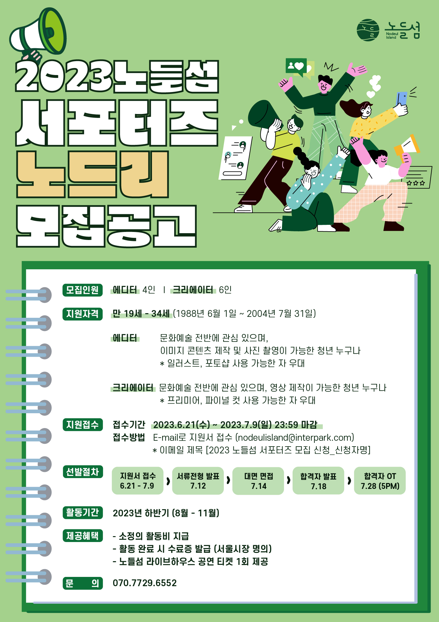 노들섬 서포터즈 노드리를 모집합니다:) ■ 모집대상 - 문화예술에 관심이 있는 청년 누구나 (만 19세 ~ 34세) ■ 신청기간 - 2023. 6. 2(수) ~ 7.9(일) ■ 신청방법 - E-mail 지원 (nodeulisland@interpark.com) (신청서 및 자세한 사항은 노들섬 홈페이지 공지사항 참조 https://nodeul.org/) ■ 활동기간 - 2023년 하반기 (8월 ~ 11월) ■ 활동내용 - [에디터] 이미지 콘텐츠 제작 및 사진촬영 - [크리에이터] 영상제작 ■ 활동혜택 - 소정의 활동비 지급 - 활동 완료 시 수료증 발급 (서울시장 명의) - 노들섬 라이브하우스 공연 티켓 1회 제공