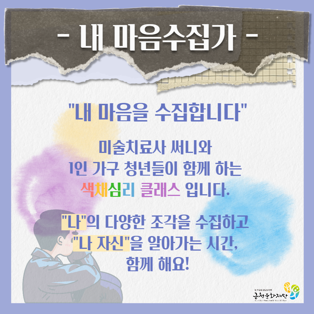 ❝ 내 마음을 수집합니다 ❞ 미술치료사 써니와 금천구 1인 가구 청년들이 함께 하는 색채심리 클래스 입니다.
