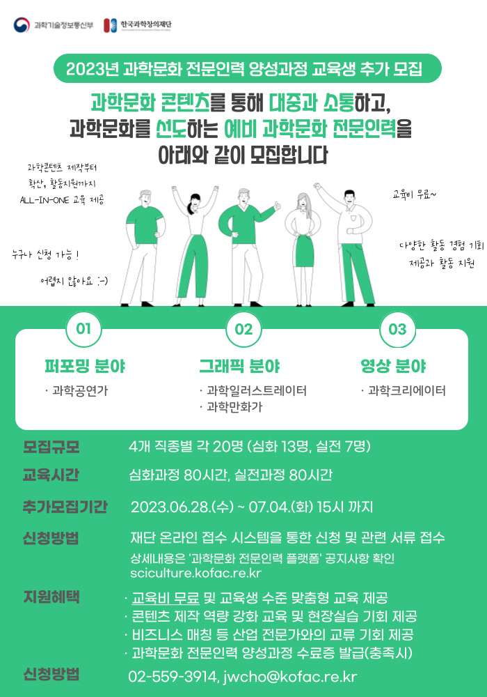 과학기술정보통신부와 한국과학창의재단은 2023년 과학문화 전문인력 양성과정 교육생을 추가 모집 합니다. (과학공연가, 과학일러스트레이터, 과학만화가, 과학크리에이터 과정)