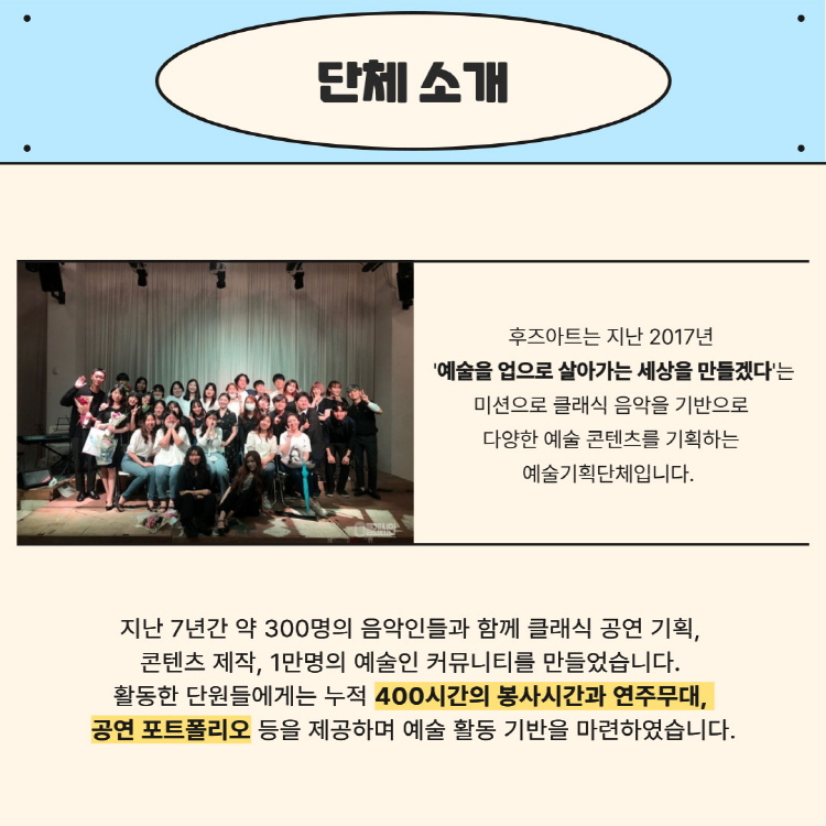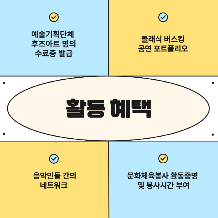 - 지원자격: 클래식 버스킹에 열정이 가득한 청년 음악인(재학생 및 졸업생 무관)