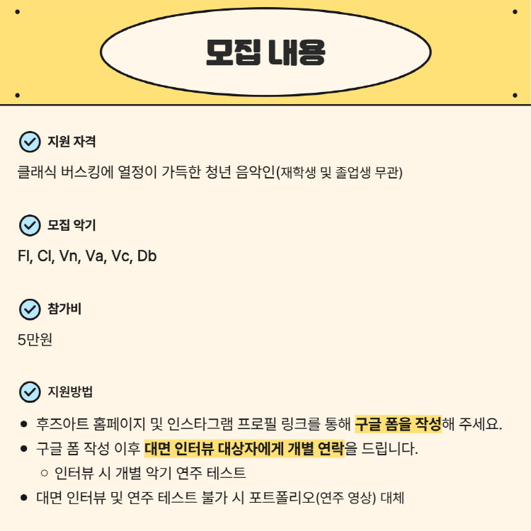 - 모집악기: FL, CL, VN, VA, VC, DB