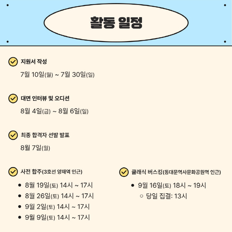 - 사전합주: 8월 19일 ~ 9월 9일 매주 토요일 14시 ~ 17시 (총 4회)