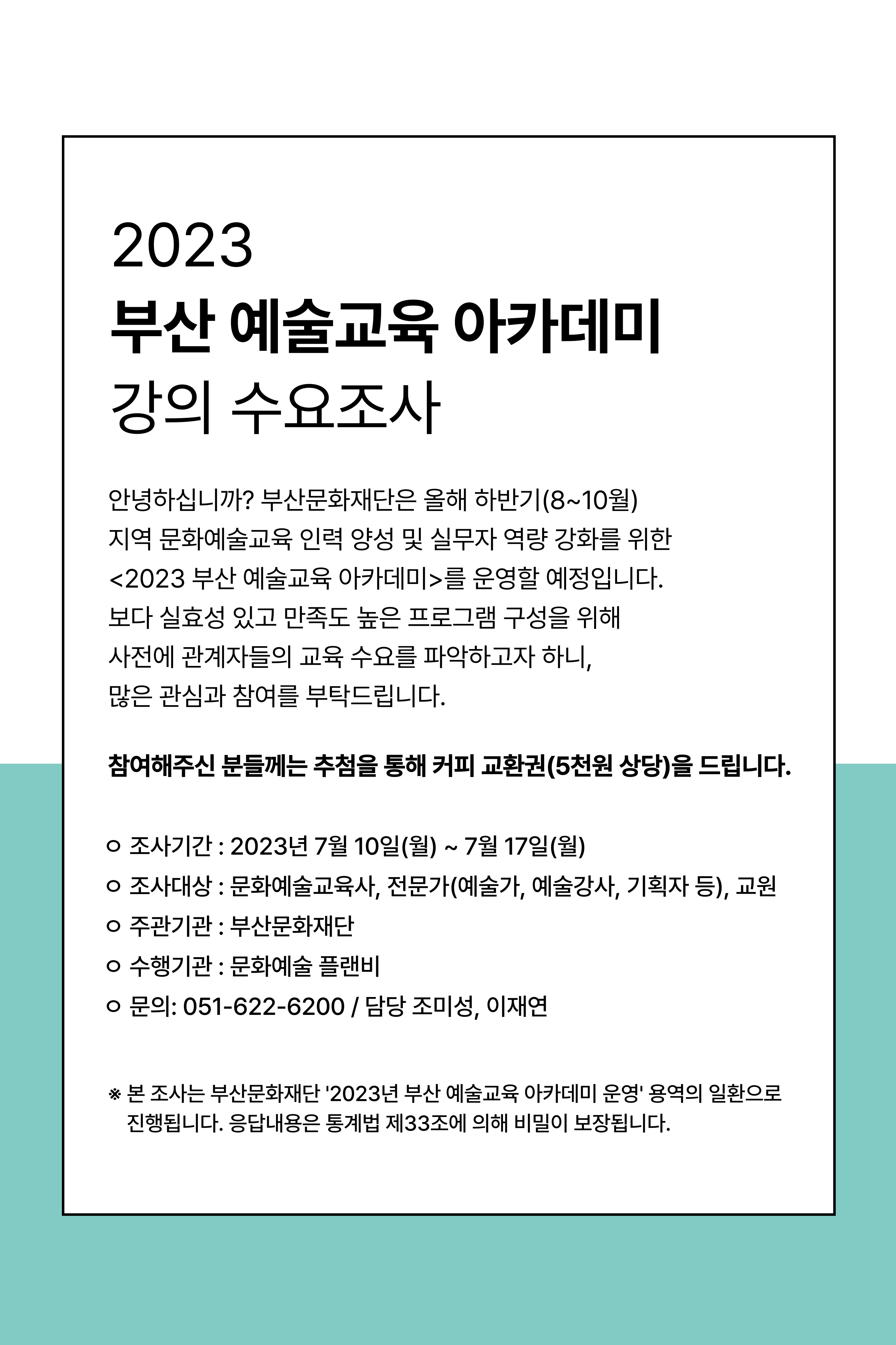 부산문화재단은 올해 하반기(8~10월) 지역 문화예술교육 인력 양성 및 실무자 역량 강화를 위한 '2023 부산 예술교육 아카데미'를 운영할 예정입니다. 보다 실효성 있고 만족도 높은 프로그램 구성을 위해 사전에 관계자들의 교육 수요를 파악하고자 하니, 많은 관심과 참여를 부탁드립니다.