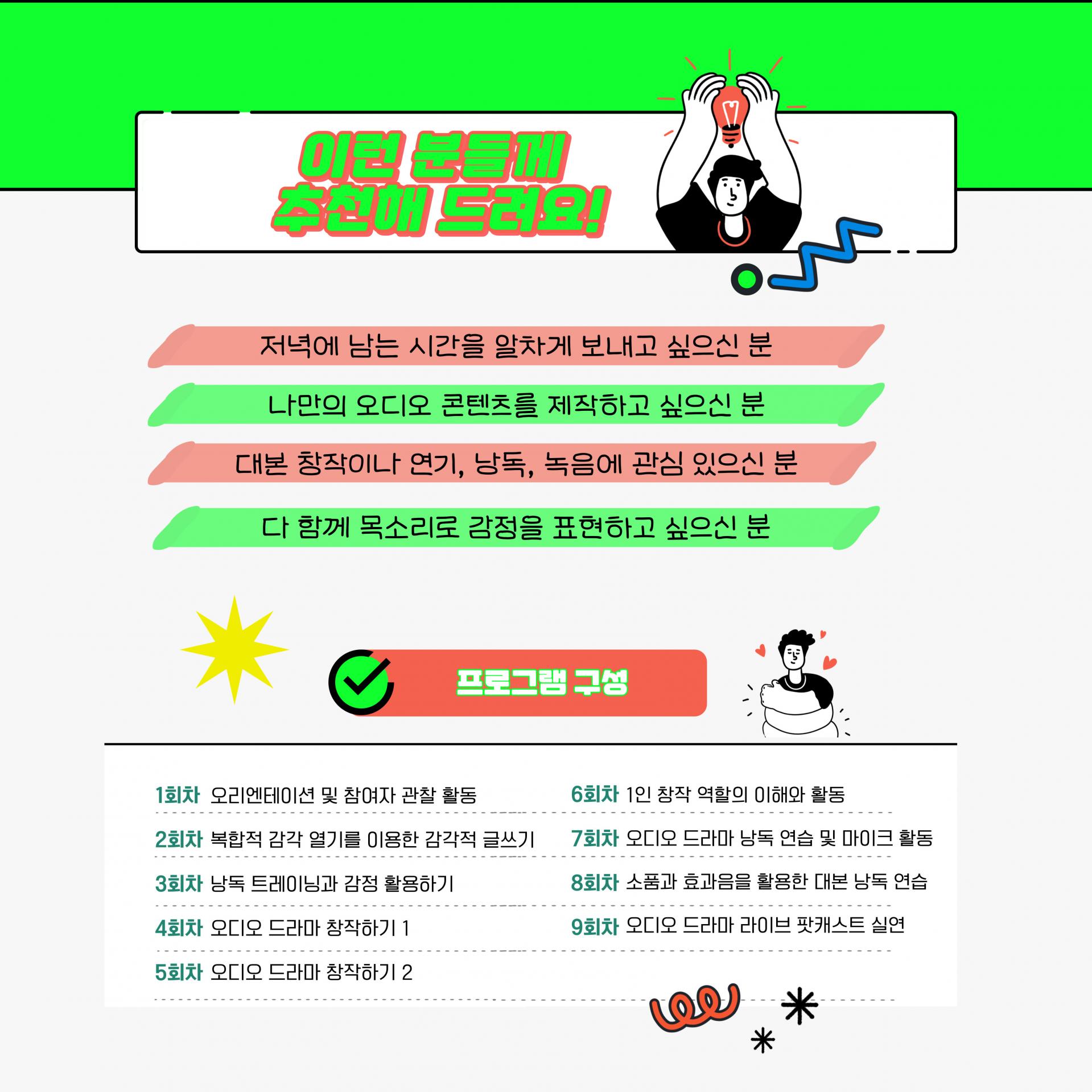 | 1회차 | 오리엔테이션 및 참여자 관찰 활동 | | 2회차 | 복합적 감각 열기를 이용한 감각적 글쓰기 | | 3회차 | 낭독 트레이닝과 감정 활용하기 | | 4회차 | 오디오 드라마 창작하기 1 | | 5회차 | 오디오 드라마 창작하기 2 | | 6회차 | 1인 창작 역할의 이해와 활동 | | 7회차 | 오디오 드라마 낭독 연습 및 마이크 활동 | | 8회차 | 소품과 효과음을 활용한 대본 낭독 연습 | | 9회차 | 오디오 드라마 라이브 팟캐스트 실연 |