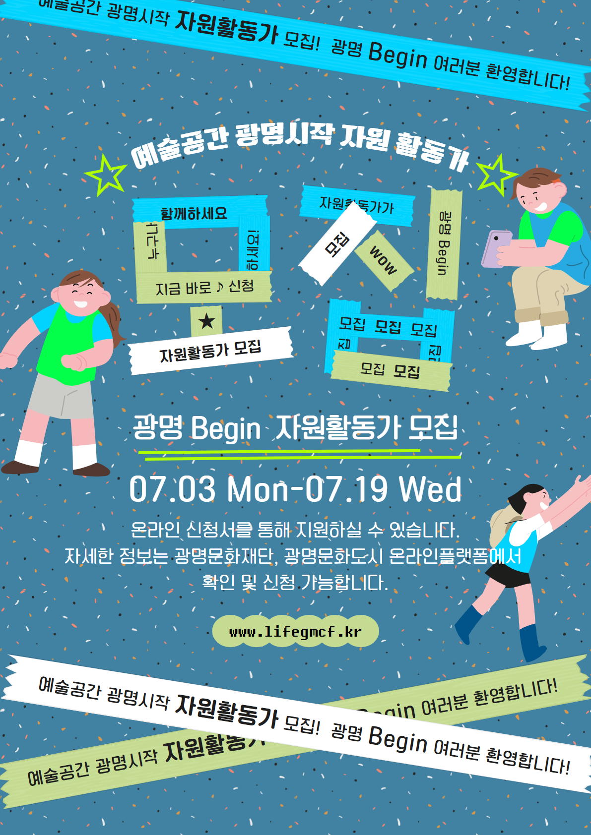 🔵모집개요 • 활동장소 : 예술공간 광명시작 (이케아 광명점 P1층) • 활동내용 : '예술공간 광명시작' 기획전시 관람 안내 • 활동기간 : 2023년 8월 5일(토) ~ 9월 24일(일) 내 전시기간 중 활동날짜 선택 가능 • 모집기간 : 2023년 7월 3월(월) ~ 7월 19일(수) • 신청자격 : 문화 예술에 관심 있는 누구나 (20세 이상)