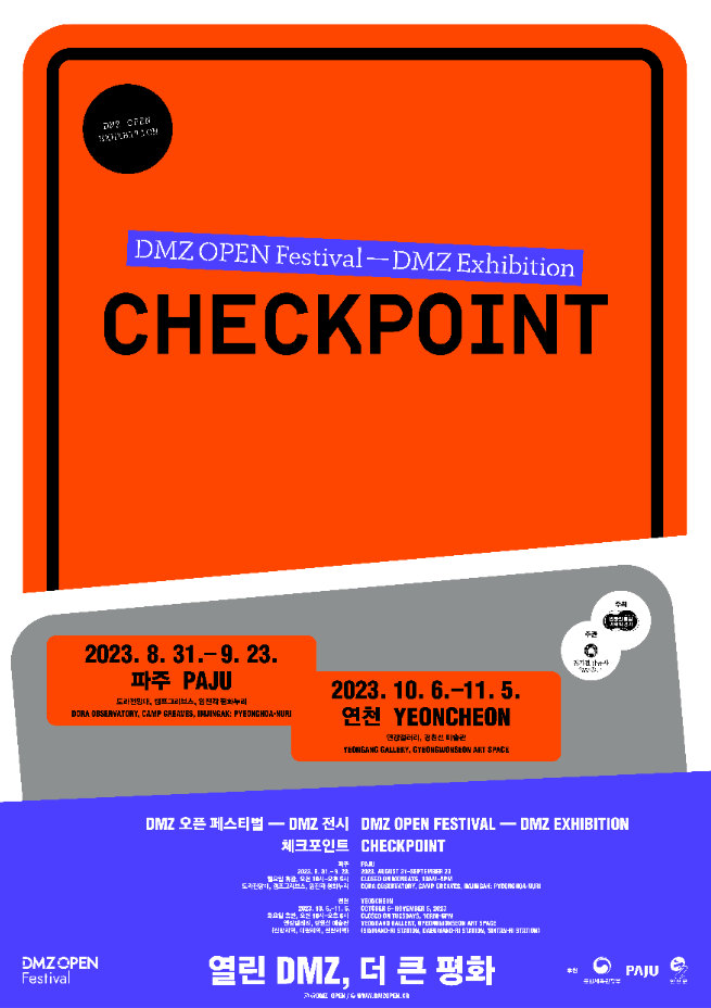 경기도 디엠지 일대에서 8월 31일부터 11월 5일까지 현대 미술 전시 ‘디엠지(DMZ) 전시: 체크포인트’를 개최합니다. 이번 전시는 2023년 디엠지 오픈 페스티벌(DMZ OPEN FESTIVAL)의 영역 중 하나로, 1부와 2부로 나누어 8월 31일부터 9월 23일까지 파주, 10월 6일부터 11월 5일까지는 연천에서 진행됩니다.