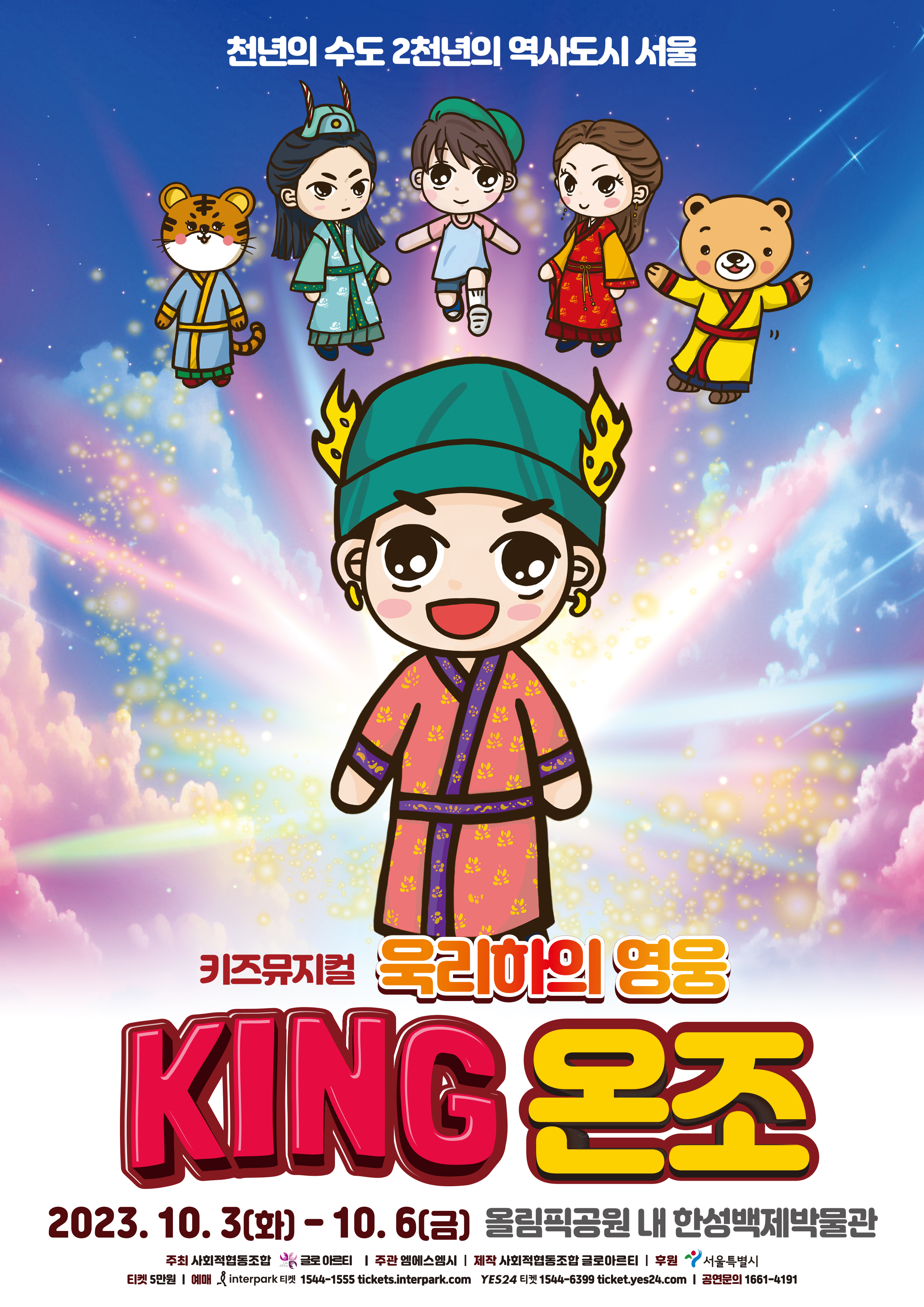 사회적협동조합 글로아르티(이사장 김미영)는 서울시의 민간축제지원사업 후원으로 키즈뮤지컬 <킹온조>를 제작하여 오는 10월 3일부터 6일까지 올림픽공원에 있는 한성백제박물관 공연장에서 무대에 올린다.