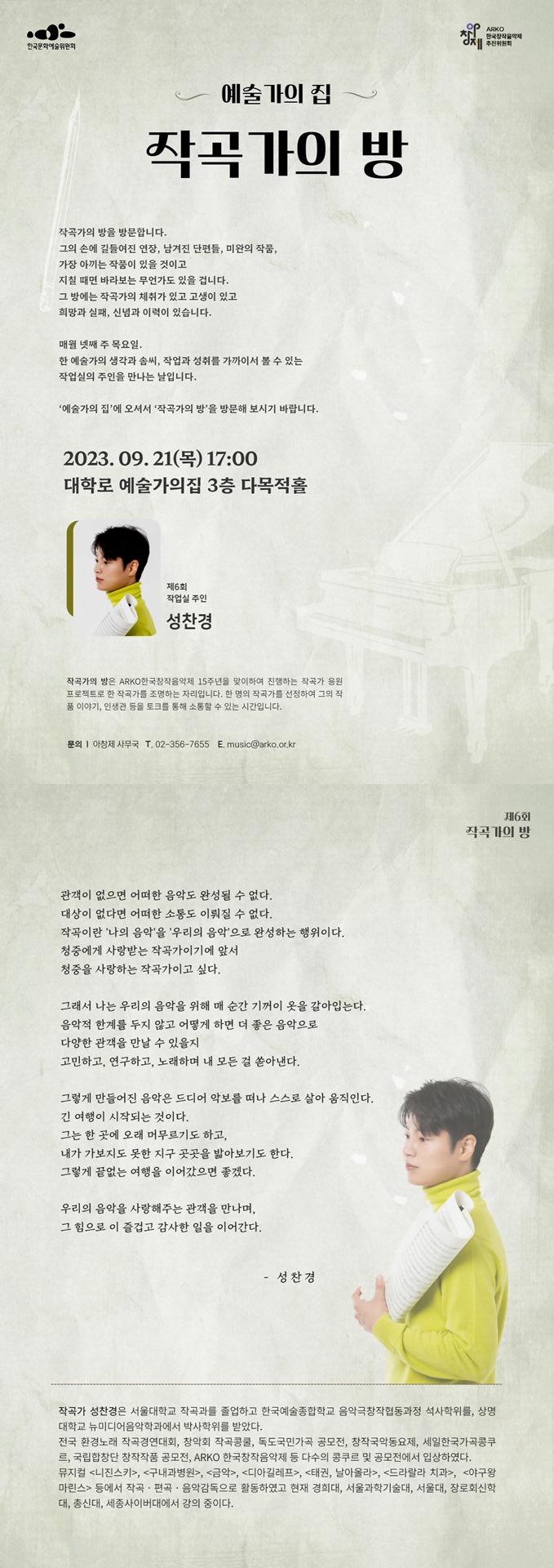 아창제 작곡가 토크콘서트 <성찬경 '작곡가의 방'>으로 초대합니다.