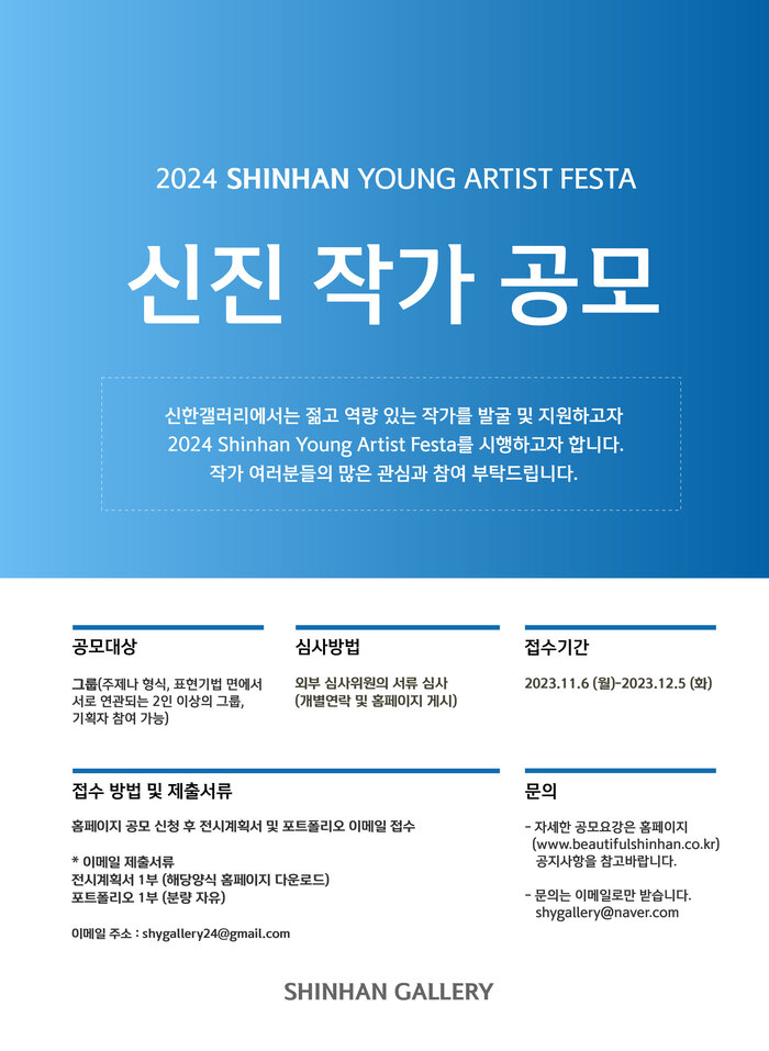 신한갤러리에서는 젊고 역량 있는 신진 작가를 발굴 및 지원하고자 2024 Shinhan Young Artist Festa를 시행하며, 참신한 작가그룹을 모집합니다. 주제나 형식, 표현기법 면에서 서로 연관되는 2인 이상의 작가그룹은 모두 참여 가능하며, 선정된 작가군은 신한갤러리에서 그룹전 개최와 전시 진행에 수반되는 전반적 과정을 지원받을 수 있습니다. 자세한 내용은 아래 공모요강을 참고 바라며 많은 관심과 지원 바랍니다. ■ 신한갤러리