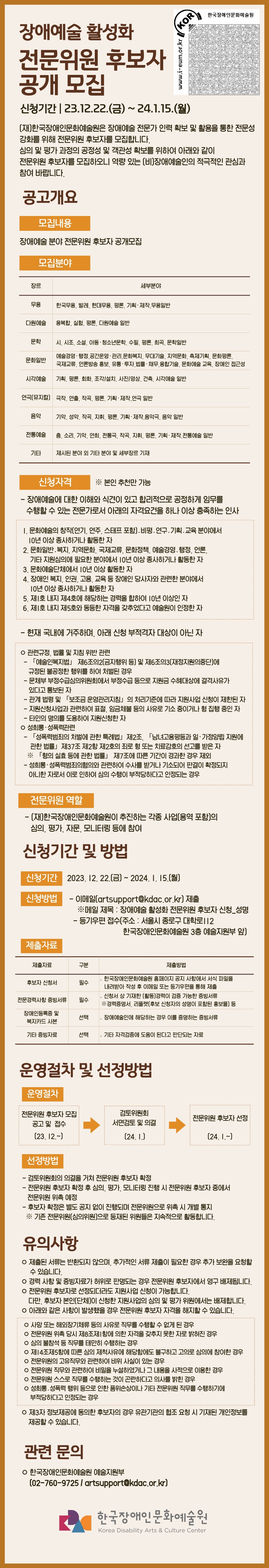 장애예술 활성화 전문위원 후보자를 공개 모집합니다. (재)한국장애인문화예술원은 장애예술 전문가 인력 확보 및 활용을 통한 전문성 강화를 위해 전문위원 후보자를 모집합니다.심의 및 평가 과정의 공정성 및 객관성 확보를 위하여아래와 같이 전문위원 후보자를 모집하오니 역량 있는 (비)장애예술인의 적극적인 관심과 참여 바랍니다. ●신청기간 : 2023.12.22.(금) ~ 2024.1.15.(월) ● 신청방법 : 이메일(artsuppt@kdac..kr) 또는 등기우편 접수 (서울시 종로구 대학로 112,한국장애인문화예술원 3층 예술지원부 앞) ● 신청자격 : 장애예술에 대한 이해와 식견이 있고 합리적으로 공정하게 임무를 수행할 수 있는 전문가 ● 전문위원 역할 : (재)한국장애인문화예술원이 추진하는 각종 사업(용역 포함)의 심의, 평가, 자문, 모니터링 등에 참여 ●문의 : 한국장애인문화예술원 예술지원부 (02-760-9725/ artsuppt@kdac..kr) 보다 자세한 내용은 한국장애인문화예술원 홈페이지(www.i-eum..kr)의 공지사항 게시글을 통해 확인해주시기 바랍니다. 상세경로 : 홈페이지→알림마당→공지사항→"장애예술 활성화 전문위원 후보자 공개 모집(~24.1.15.(월))" 링크 : https://bitly.ws/38IHS