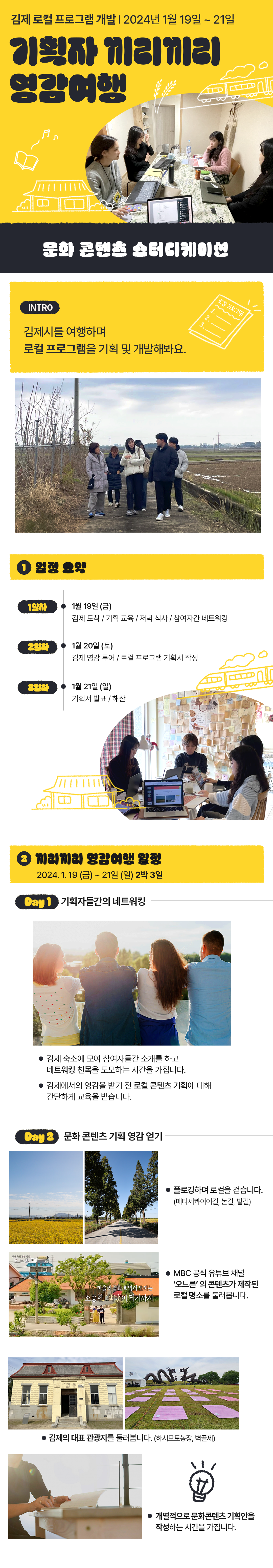 ✱ 일정 요약 - 1일차 김제 시티투어 / 기획 교육 / 저녁 식사 / 참여자간 네트워킹 - 2일차 김제 로컬 영감 여행 / 로컬 프로그램 기획 및 개발 - 3일차 기획서 발표 / 해산