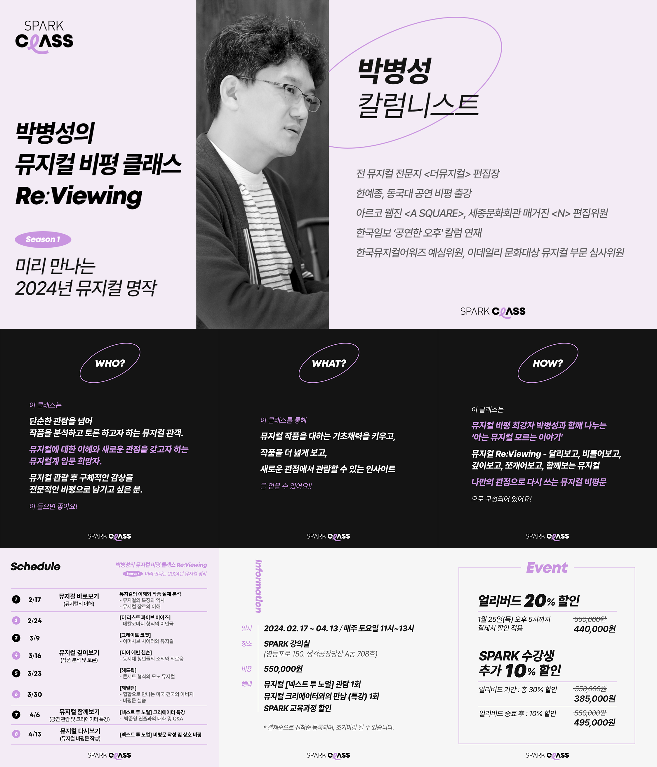 박병성의 뮤지컬 비평 클래스 Re:Viewing Season1_미리 만나는 2024년 뮤지컬 명작 ⠀ 스파크가 뮤지컬 공연에 진심인 분들을 위해 기획한 #박병성의_뮤지컬비평클래스_ReViewing 에서 2024년 올라갈 뮤지컬 명작을 미리 만나보실 수 있습니다!