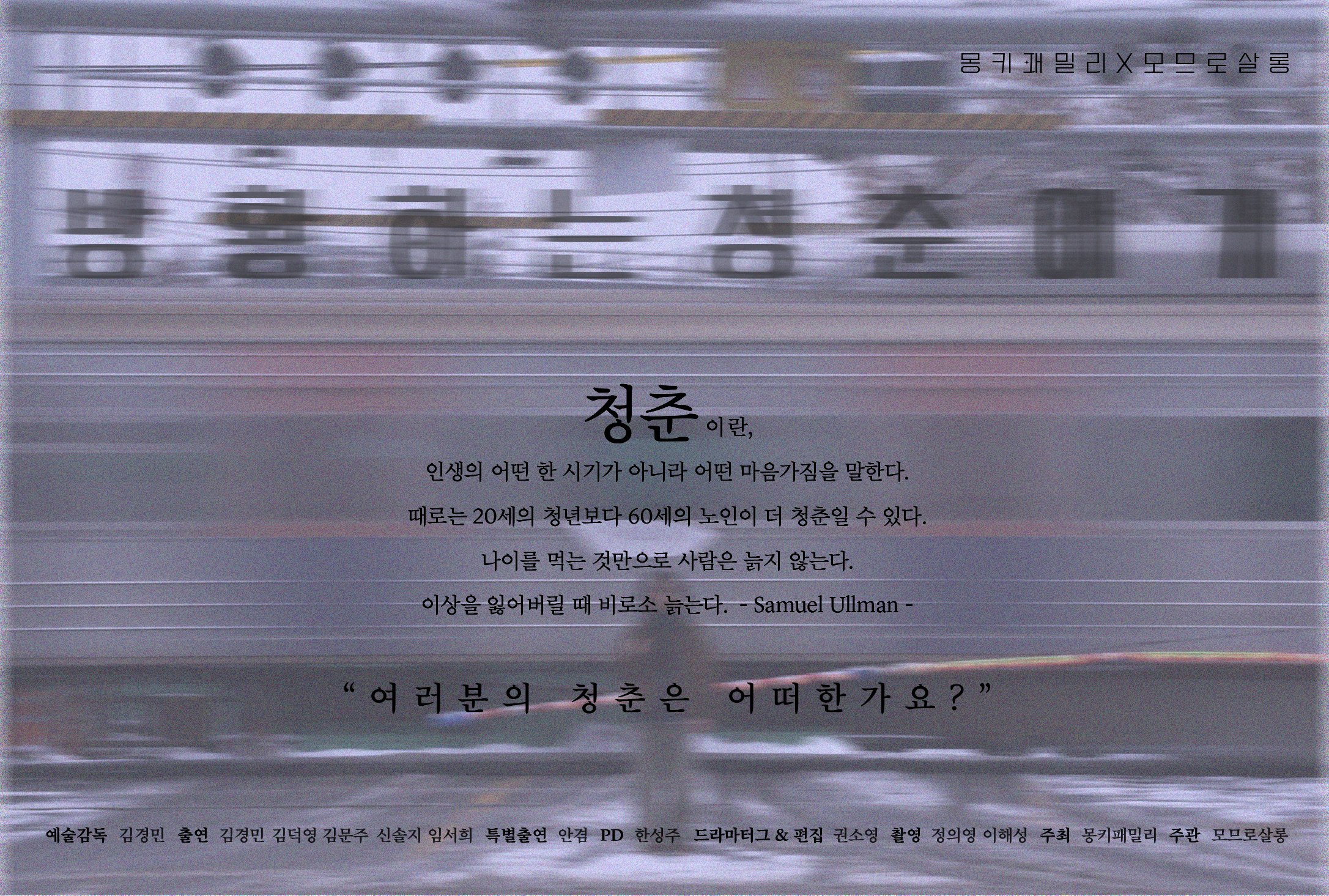 [공연정보] 🍌공연일시 : 24.1.26(금)~27(토) 오후 7시 30분 🍌장소 : 모므로살롱 (서울 성동구 서울숲2길 45-1,3층) 🍌러닝타임 : 약 60분 🍌티켓 : 20,000원(음료 1잔 포함) [크레딧] 🐒예술감독 : 김경민 🐒출연 : 김경민, 김덕영, 김문주, 신솔지, 임서희 🐒특별출연 : 안겸 🐒PD : 한성주 🐒드라마터그 : 권소영 🐒촬영 : 정의영. 이해성 🐒주최 : 몽키패밀리 🐒주관 : 모므로살롱 [공연내용] 이번 공연은 나이에 상관없이 모든 이들에게 청춘의 의미를 되새겨주며 이상을 잃지 않는 한 우리 모두가 청춘일 수 있다는 메세지를 전달하고 있습니다. 관객 여러분들이 공연을 보면서 자신의 삶과 어떻게 연결 지을 수 있고 삶에 어떠한 가치와 목표를 이룰 것 인지에 대해 생각하는 계기가 되는 시간이 되었으면 좋을 것 같습니다.