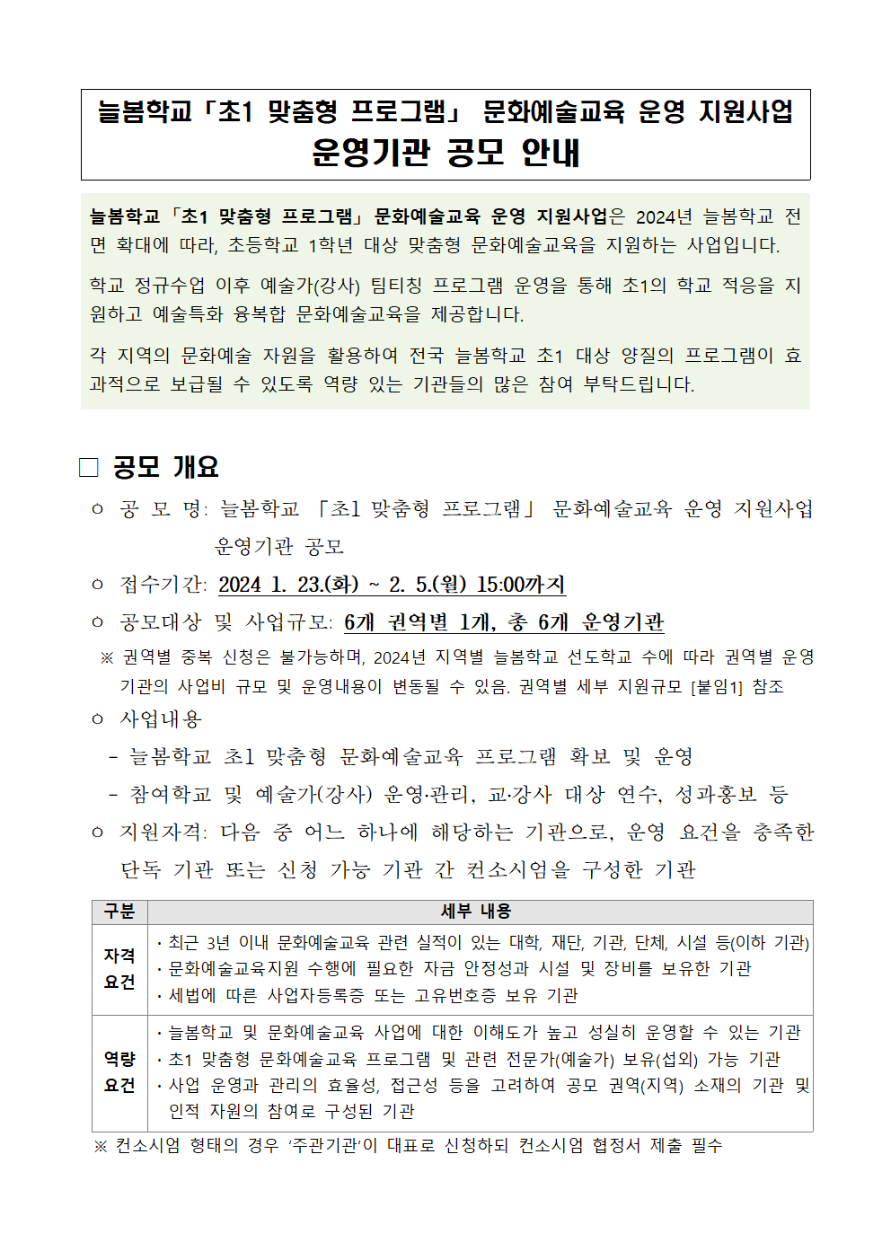 늘봄학교 「초1 맞춤형 프로그램」 문화예술교육 운영 지원사업 운영기관 공모