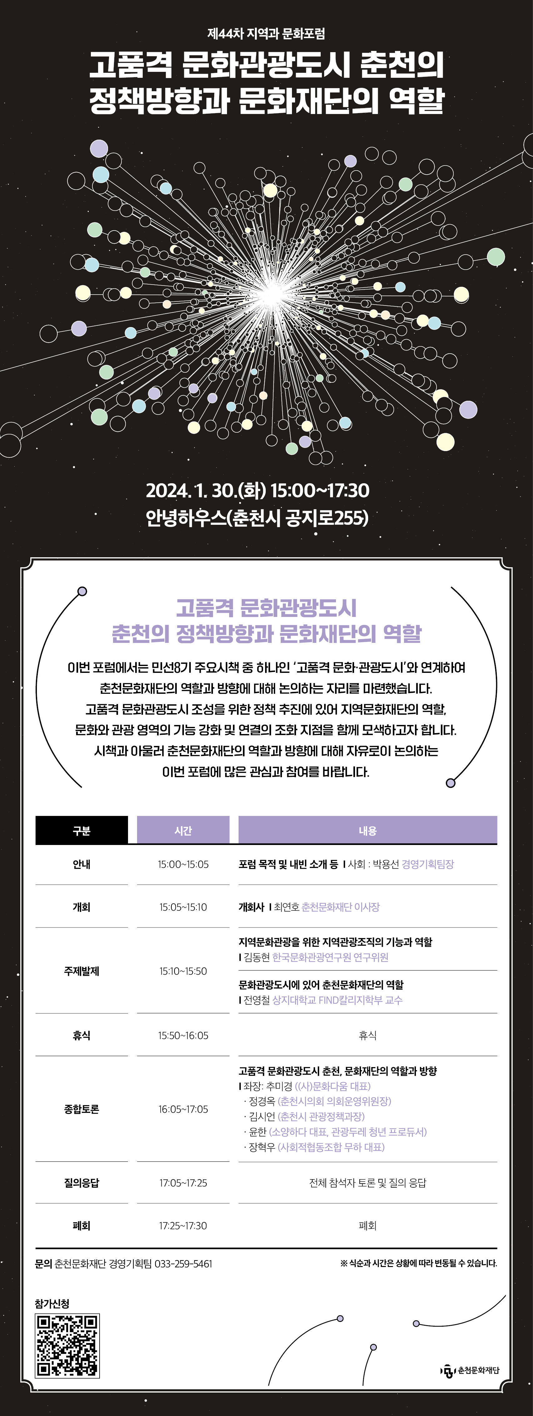 📢 춘천문화재단은 민선 8기 주요 시책 중 하나인 '고품격 문화·관광도시'와 연계하여 재단의 역할과 방향에 대해 논의하는 자리를 마련했습니다. 이번 포럼을 통해 고품격 문화관광도시 조성을 위한 정책 추진에 있어 지역문화재단의 역할, 문화와 관광 영역의 기능 강화 및 연결의 조화 지점을 함께 모색하고자 합니다. 시책과 아울러 춘천문화재단의 역할과 방향에 대해 자유로이 논의하는 본 포럼에 많은 관심과 참여 부탁드립니다. <포럼안내> 일시: 2024. 1. 30.(화) 15:00 ~ 17:30 장소: 안녕하우스(춘천시 공지로 255) 참여신청: https://fms.gle/xTaViYcJp1rS2xKw8 신청기간: ~ 1. 29.(월)까지 문의: 춘천문화재단 경영기획팀 033-259-5461