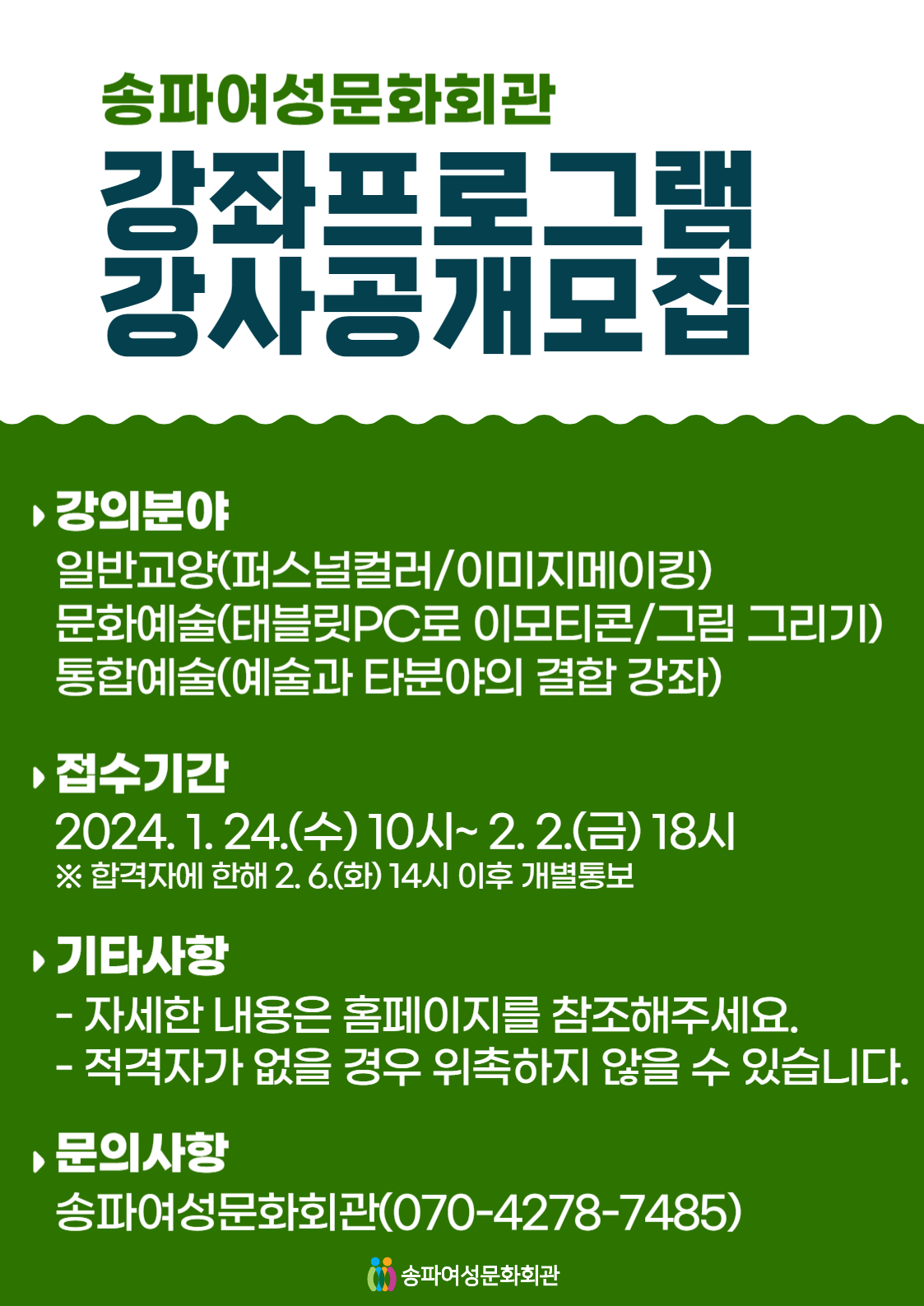 2024년2분기 송파여성문화회관 강좌 프로그램 강사 공개 모집 송파여성문화회관 강좌 프로그램을 이끌어 갈 유능한 교육 강사를 다음과 같이 공개 모집하오니 역량 있는 분들의 많은 지원 바랍니다.