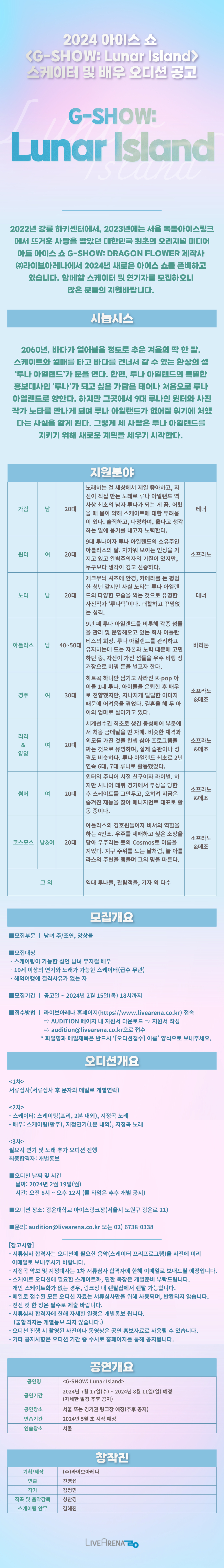 안녕하세요. 국내 최초 미디어아트 아이스 쇼 <G-SHOW: DRAGON FLOWER> 기획/제작사 라이브아레나입니다. 2022년 강릉 하키센터, 2023년 서울 목동아이스링크에서 받았던 뜨거운 사랑과 성원 보답을 위해 2024년 새로운 아이스 쇼를 기획하였습니다. 새로운 판타지 세계를 펼쳐나갈 루나아일랜드와 함께할 배우를 모집합니다. 많은 관심과 지원 부탁드립니다. 감사합니다.