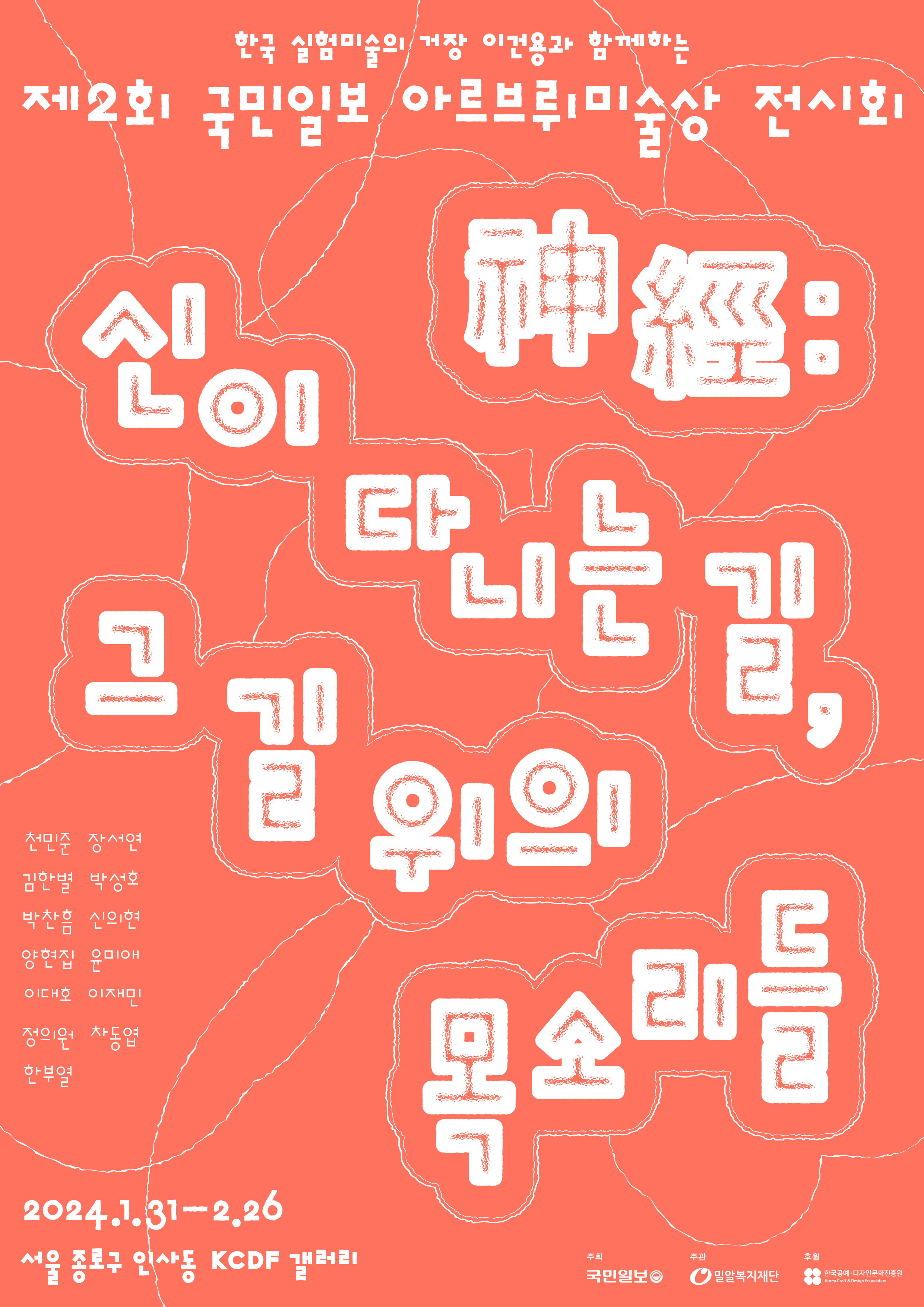 안녕하세요. 제2회 '국민일보 아르브뤼미술상' 수상 작가 13인의 작품 전시에 초대합니다. 우리나라 실험 미술의 거장 이건용 작가와 함께하는 ‘국민일보 아르브뤼미술상’ 공모에 선정된 작가 13인의 전시가 1월 31일(수)부터 2월 26일(월)까지 서울 인사동 KCDF갤러리에서 개최됩니다. 국민일보 아르브뤼미술상은 장애인과 비장애인 구분 없이 살아가는 '경계 없는 세상', '경계 없는 대한민국'을 만드는데 기여하기 위해 기획되었습니다. 이 상은 사회적 약자를 지원하는 복지의 개념을 탈피하고 순수하게 미술의 관점에서 기획 운영된다는 점에서 기존 수상 제도와 차이가 있습니다. 심사에는 심상용 서울대 미대 교수(서울대미술관장), 최은주 서울시립미술관장, 유화수 시각예술가 겸 장애예술활동가 등 3인이 참여하여 전문성을 높였습니다. 이 공모전은 이번 제2회부터 '발달장애' 대신 '신경다양성'이라는 용어를 사용함으로써 장애를 위계의 문제가 아니라 차이를 나타내는 개념으로 받아들이는 인식의 변화를 촉구하고자 합니다. 단순히 역량 있는 신진 작가를 발굴하는 장이 되는 것을 넘어, 한국 사회가 포용적이고 차별 없는 성숙한 사회로 나아가는데 교두보가 되고자 합니다. 이 공모전이 차이를 존중하고 포용성의 가치를 강조함으로써, 우리 사회 뿌리깊은 비장애중심주의를 극복하며 가능성 있는 작가들에게 창작 기회를 제공하는 마당이 되기를 희망합니다. 많은 관심과 참여 부탁드립니다. 새롭게 다가올 2024년 행복한 날들이 가득하시길 소망합니다. 감사합니다. 국민일보 대표이사 변재운 국민일보 총괄기획 손영옥 제2회 국민일보 아르브뤼미술상 전시회 《神經: 신이 다니는 길, 그 길 위의 목소리들》 전시 일시 : 2024.1.31.-2.26 (설날 당일 휴관) 서울 종로구 인사동 KCDF 갤러리 (서울특별시 종로구 인사동11길 8) ○ 전시 이벤트 1. 아트 토크: 장애미학 암중모색 일시: 2.7(수) 14:00-16:00 장소: 서울 종로구 인사동 KCDF 갤러리 (서울특별시 종로구 인사동11길 8) 발표자 : 심상용 서울대미술관장/최창희 장애예술비평가/유화수 작가 겸 장애예술활동가 모더레이터 손영옥 미술평론가·국민일보 문화전문기자 겸 논설위원 2. 아트 팩토리 : 전시장 속 스튜디오 2.8(목) 14:00-15:00 천민준 작가 2.15(목) 14:00-15:00 한부열 작가 2.22(목) 14:00-15:00 윤미애 작가