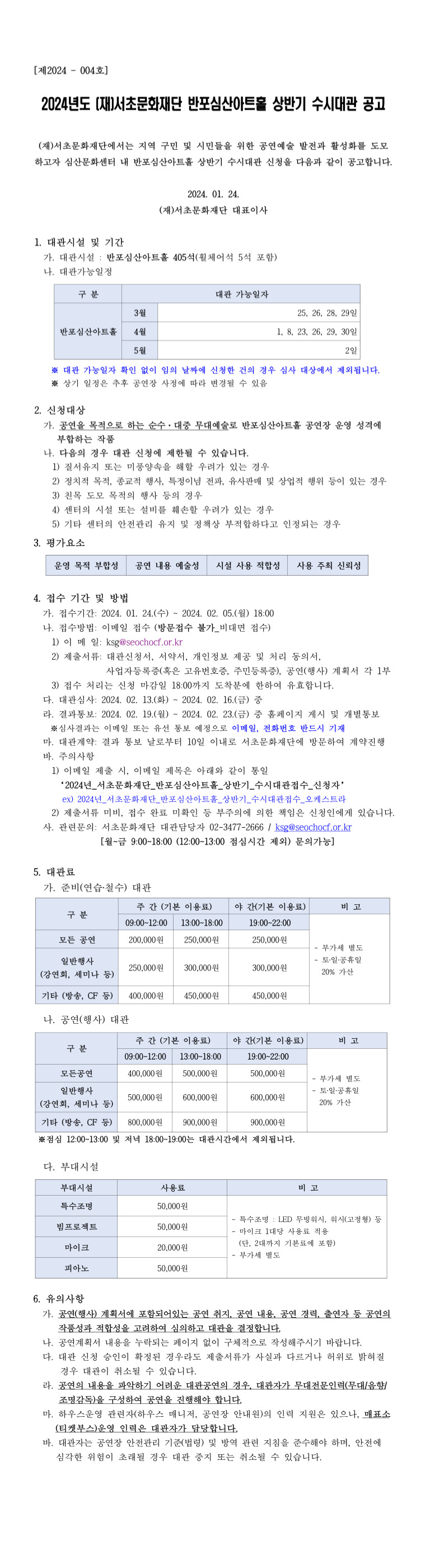 2024년도 (재)서초문화재단 반포심산아트홀 상반기 수시대관 공고