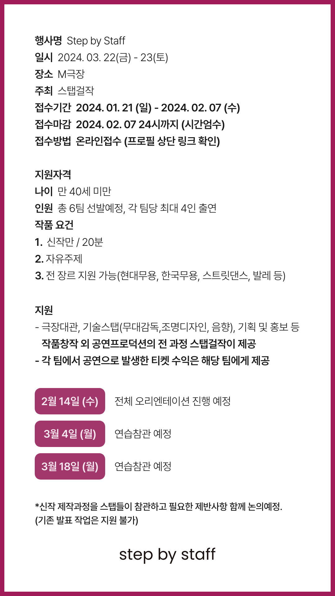 차세대무용인들을 위한, step by Staff 공모 (2024.01.21 - 2024.02.07)