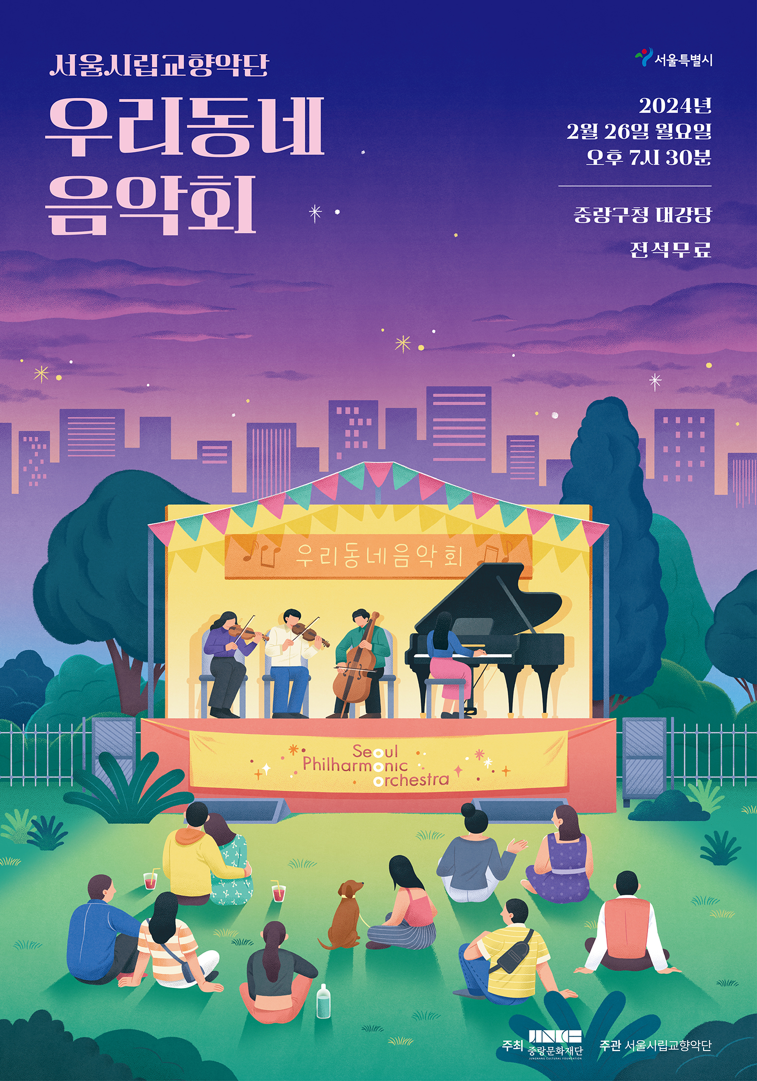 공연 제목 : 서울시립교http://향악단 우리동네 음악회 공연 일시 : 2024년 2월 26일(월) 오후 7시 30분(60분) 공연 장소 : 중랑구청 대강당 주 최 : 중랑문화재단 주 관 : 서울시립교향악단 문 의 : 02-3407-6553 - 티켓 무료 - 만 6세 이상 이용가