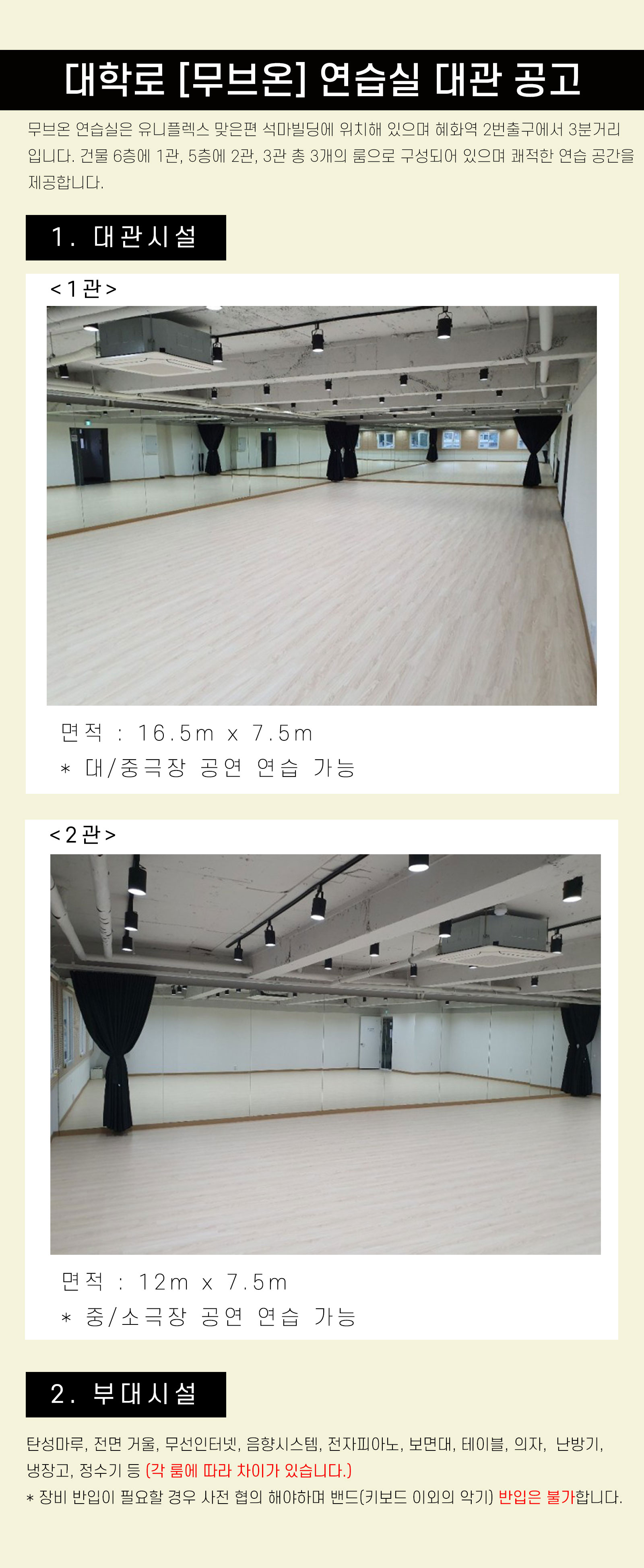 안녕하세요, 무브온입니다. 무브온 연습실은 유니플렉스 맞은편 석마빌딩에 위치한 지상 연습실입니다. (4호선 혜화역 2번 출구, 도보 3분 거리) 1관, 2관의 장기 대관 팀을 모집하고 있습니다. 대관 신청 가능 기간은 2024년 3월-2025년 2월이며, 대관 신청은 메일을 통해 접수 가능하며 선착순으로 마감됩니다. 각 관 부대 시설 및 대관료 등 자세한 사항은 하기 내용과 네이버 홈페이지 내의 상세 정보 확인 부탁드립니다. 1. 대관 시설 <1관> 면적 : 16.5m x 7.5m * 대/중극장 공연 연습 가능 <2관> 면적 : 12m x 7.5m * 중/소극장 공연 연습 가능 2. 대관 신청 양식 <신청양식> 단체공연명 : 담당자 : 연락처 : 희망 사용 기간 / 시간 : 희망사용 룸 : 사용 용도 : 사용 인원 : 3. 메일 주소 moveoninfo@naver.com 4. 네이버 사이트 https://moveonstage.modoo.at