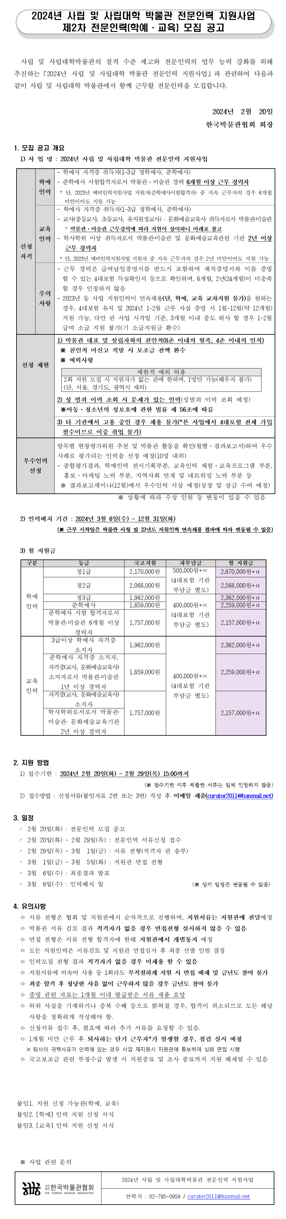 [한국박물관협회] 2024년 사립 및 사립대학박물관 전문인력 지원사업 2차 공고