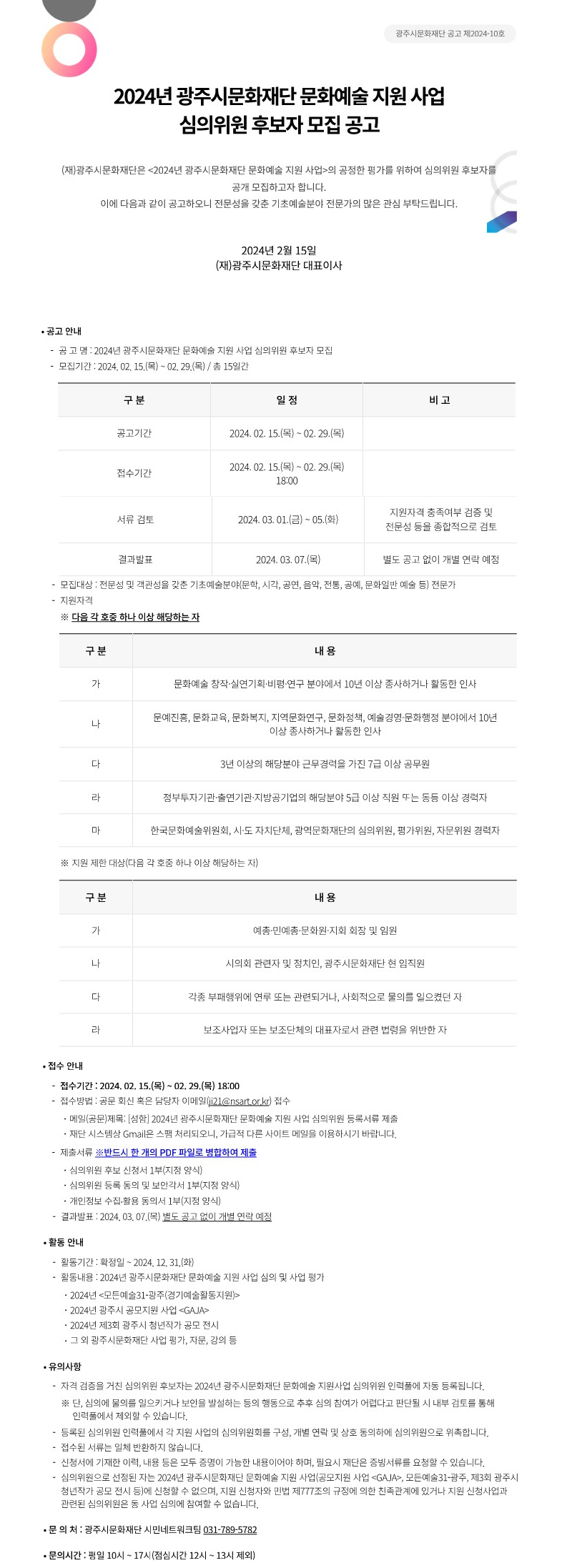 2024년 광주시문화재단 문화예술 지원 사업 심의위원 후보자 모집 공고