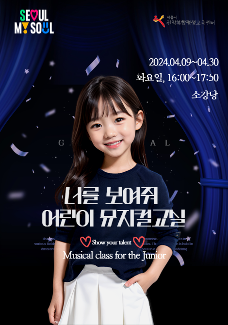 교육내용 뮤지컬 작품의 캐릭터를 시연하여 표현 방법의 다양성을 찾고 노래, 연기, 움직임을 통해 상상력과 창의력을 키워주는 프로그램 교육기간 2024.04.09~2024.04.30 화요일 교육시간 16:00~17:50 대상 초등학생 3~6학년 □ 강사 약력 – 권하경 강사 - 입시전문서울연기학원 연극영화 입시반 뮤지컬수업 강의 - TH액팅아카데미 대학입시 뮤지컬 수업, 배우의 꿈 뮤지컬 특강 강의 - 일산본스타트레이닝센터 중고생 입시 뮤지컬 수업, 무료특강 뮤지컬반 수업 강의