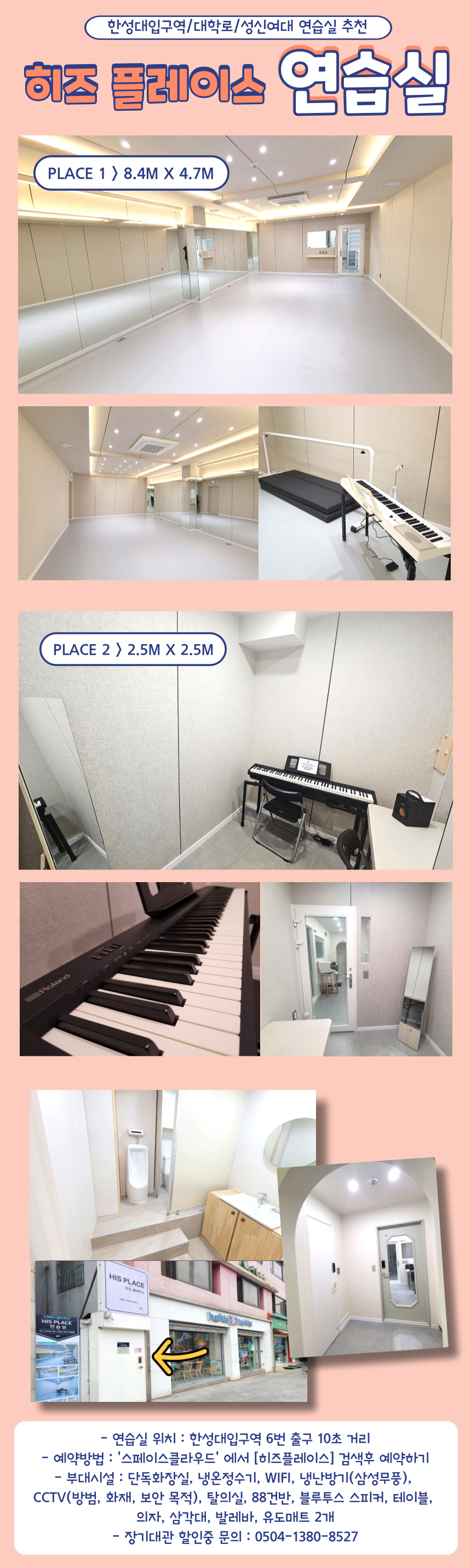한성대입구역 6번 출구 10초 거리에 위치한 <H.I.S. PLACE 연습실> 입니다.