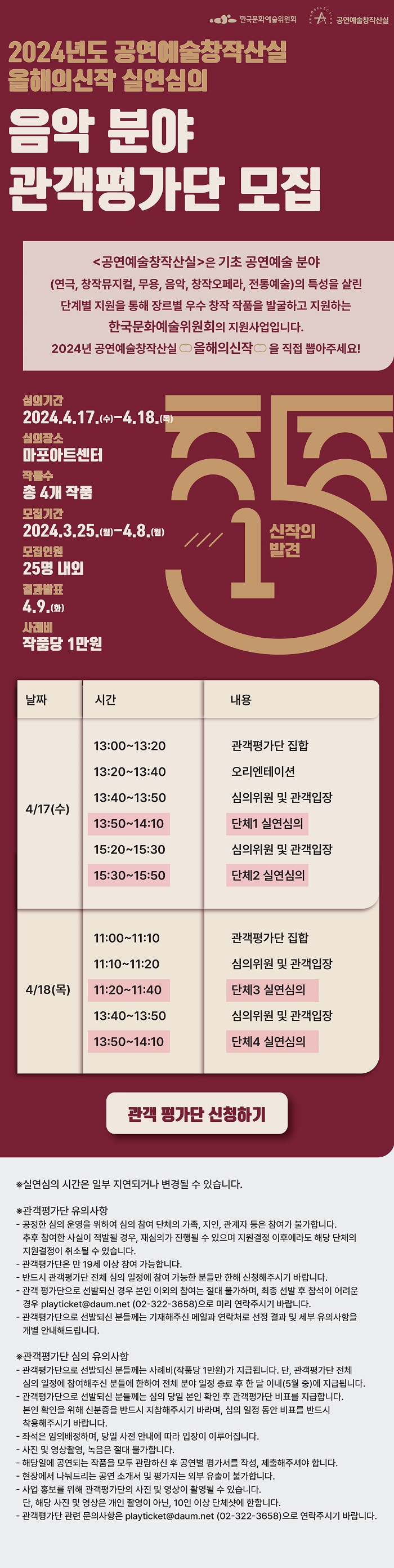 2024 창작산실 올해의신작 실연심의가 진행중에 있습니다!! 다섯번째, 음악 분야의 관객평가단을 모집합니다. 기초 공연예술 분야를 단계별로 지원하여 우수 창작 작품을 발굴하고 지원하는 한국문화예술위원회의 지원사업이에요. 직접 보고 ‘올해의신작’을 뽑아보는 특별한 경험 해보세요! 세부 심의일정 및 유의사항 등 공고문을 꼼꼼히 읽어보시고 신청해주시길 바랍니다. [심의 일정] 심의기간 : 2024. 4.17(수) ~ 4.18(목) 심의장소 : 마포아트센터 작품수 : 총 4개 작품 [모집 일정] 모집기간 : 2024. 3. 25(월) ~ 4. 8(월) 결과발표 : 4.9(화) 모집인원 : 25명 내외 *위의 신청링크를 통해 신청해주세요!