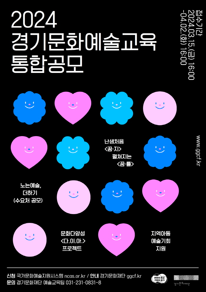 경기문화재단 예술교육팀에서 지속 가능한 문화예술교육 기반 마련 및 문화예술교육의 가치 확산을 목표로 「2024 경기문화예술교육 통합공모」를 진행하오니, 많은 관심과 신청 부탁드립니다.