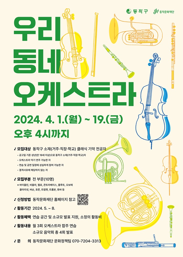 [우리 동네 오케스트라 참여자 모집 안내] 재단법인 동작문화재단은 동작구 클래식 기반 지역문화 활성화를 도모하고 구민의 일상 문화 향유 기회를 증진하기 위하여 생활문화 활성화 지원사업 <우리 동네 오케스트라> 참여자를 다음과 같이 모집합니다. 많은 관심과 참여 바랍니다. ○ 사 업 명 : 생활문화 활성화 지원사업 <우리 동네 오케스트라> ○ 사업내용 1) 동작구 클래식 기악 전문예술가들로 구성된 오케스트라 창단 2) 동작구민의 클래식 향유 기회를 증진할 수 있는 소규모 음악회 공연 ○ 모집기간 : 2024. 4. 1.(월) ~ 4. 19.(금) 16:00까지, 19일간 ○ 모집부문 : 전 부문(10명) ※ 바이올린·비올라·첼로·콘트라베이스·플루트·오보에·클라리넷·바순·호른·트럼펫·트롬본·튜바 등 ○ 신청방법 : 동작문화재단 홈페이지 참고 ○ 신청자격 : 동작구 소재(거주·직장·학교) 클래식 기악 전공자 ※ 동작구 거주자 우대 ○ 활동기간 : 2024년 5월 ~ 8월 ○ 활동혜택 : 연습 공간 및 소규모 발표 지원, 소정의 활동비 ○ 활동내용 : 월 3회 오케스트라 합주 연습, 소규모 음악회 총 4회 발표 [동작문화재단 <우리 동네 오케스트라> 참여자 모집 바로가기] https://www.idfac..kr/bbs/board.php?bo_table=notice&wr_id=243