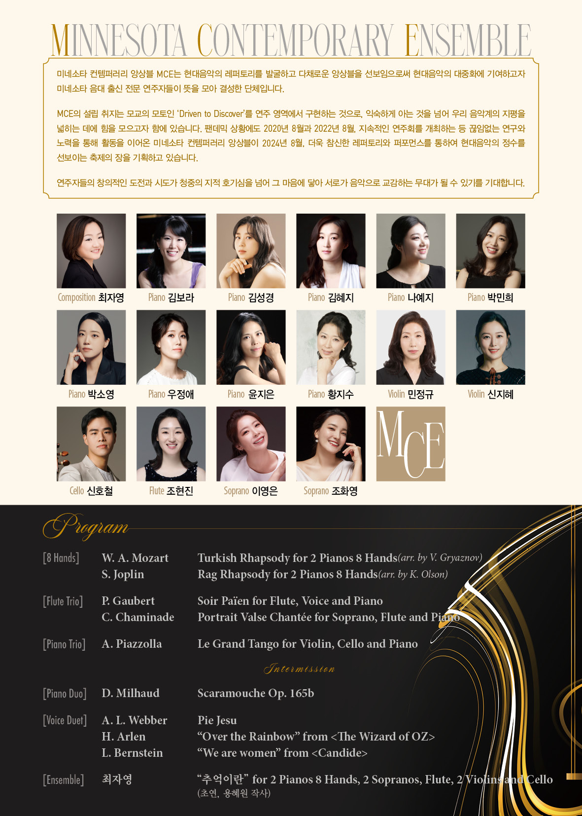 미네소타 컨템퍼러리 앙상블 MCE는 현대음악의 레퍼토리를 발굴하고 다채로운 앙상블을 선보임으로써 현대음악의 대중화에 기여하고자 미네소타 음대 출신 전문 연주자들이 뜻을 모아 결성한 단체입니다.