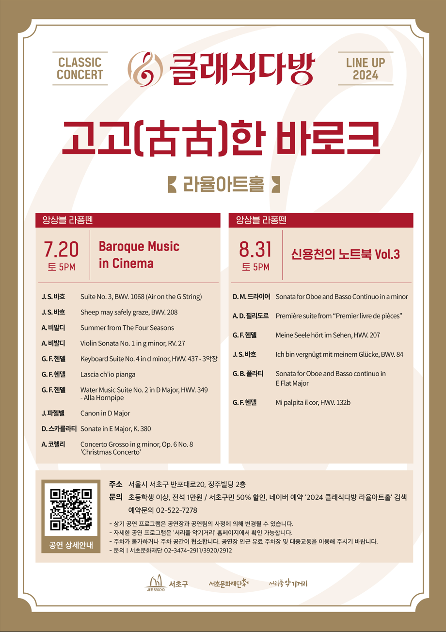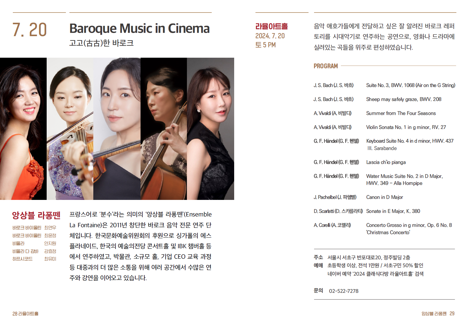 J. B. 륄리 - Marche pour la cérémonie des Turcs M. 마레 - Les Folies d’Espagne J. S. 바흐 - Suite No. 3, BWV 1068 (Air on the G ) A. 비발디 - Summer from The Four Seasons A. 비발디 - Violin Sonata No. 1 in g min, RV. 27 G. F. 헨델 - Sarabe G. F. 헨델 - Lascia ch'io pianga J. S. 바흐 - Goldberg Variations, BWV 988 “Aria” J. 파헬벨 - Canon in D Maj J. 파헬벨 - Ciacona in f min