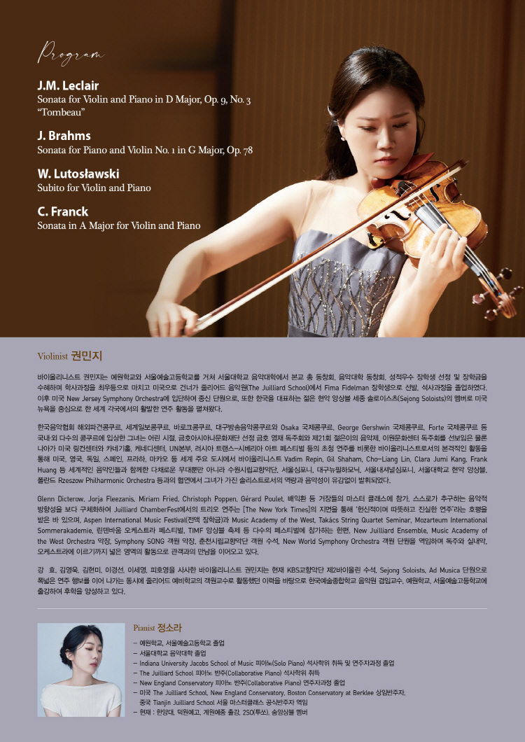 바이올리니스트 권민지는 예원학교와 서울예술고등학교를 거쳐 서울대학교 음악대학에서 본교 총 동창회, 음악대학 동창회, 성적우수 장학생 선정 및 장학금을 수혜하며 학사과정을 최우등으로 마치고 미국으로 건너가 줄리어드 음악원(The Juilliard School)에서 Fima Fidelman 장학생으로 선발, 석사과정을 졸업하였다. 이후 미국 New Jersey Symphony chestra에 입단하여 종신 단원으로, 또한 한국을 대표하는 젊은 현악 앙상블 세종 솔로이스츠(Sejong Soloists)의 멤버로 미국 뉴욕을 중심으로 한 세계 각국에서의 활발한 연주 활동을 펼쳐왔다.