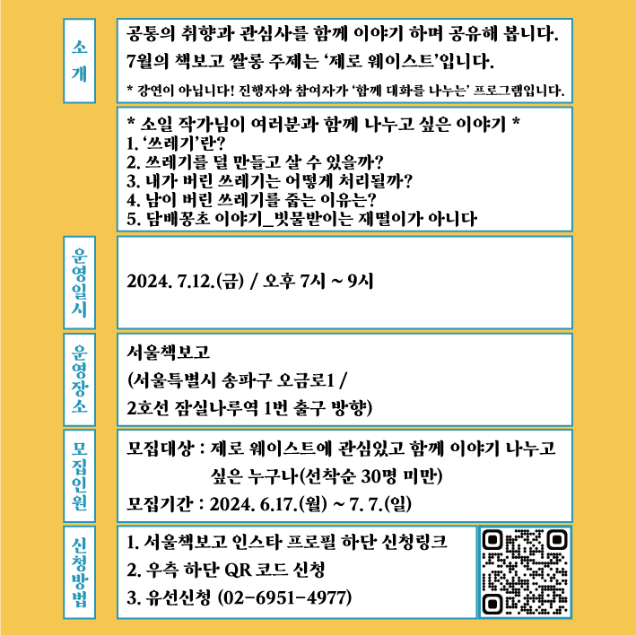 책보고 쌀롱(7월) ; 제로 웨이스트 2024년 7월 다섯 번째 <책보고 쌀롱>의 문이 열립니다. 제로 웨이스트, 음악, 브릭아트, 사진, 반려동물 등 매월 다른 주제별 진행자가 여러분과 함께 나누고 싶었던 주제와 질문들을 이야기하며, 공통의 취향과 관심사에 대한 다양한 생각을 공유하는 시간을 가져봅니다. *강연이 아닙니다. 주제에 대해 함께 이야기를 나누는 프로그램입니다.* 7월 책보고 쌀롱 의 주제는 '제로 웨이스트' 입니다. 『나는 윤리적 최소주의자, 지구에 삽니다』,『제로 웨이스트는 처음인데요』의 저자인 소일 작가님 이 모임의 진행자가 되어 여러분과 '제로 웨이스트' 를 주제로 아래의 이야기를 나누는 시간을 가져봅니다. 🗑 쓰레기란? 🌏 쓰레기를 덜 만들고 살 수 있을까? ♻ 내가 버린 쓰레기는 어떻게 처리될까? 💦 남이 버린 쓰레기를 줍는 이유는? 🚬 담배 꽁초 이야기 - 빗물받이는 재떨이가 아니다 ○운영일시○ 2024. 7.12.(금) / 오후 7:00~9:00 예정 ○운영장소○ 서울책보고 (서울시 송파구 오금로1 / 2호선 잠실나루역 1번 출구 방향) ○모집기간○ 2024. 6.17.(월) ~ 7. 7.(일) ○모집대상○ 제로 웨이스트에 관심있고 함께 이야기 나누고 싶은 누구나(30명 미만) ○신청방법○ 1) 온오프믹스 신청바로가기 2) 유선신청(02-6951-4977)