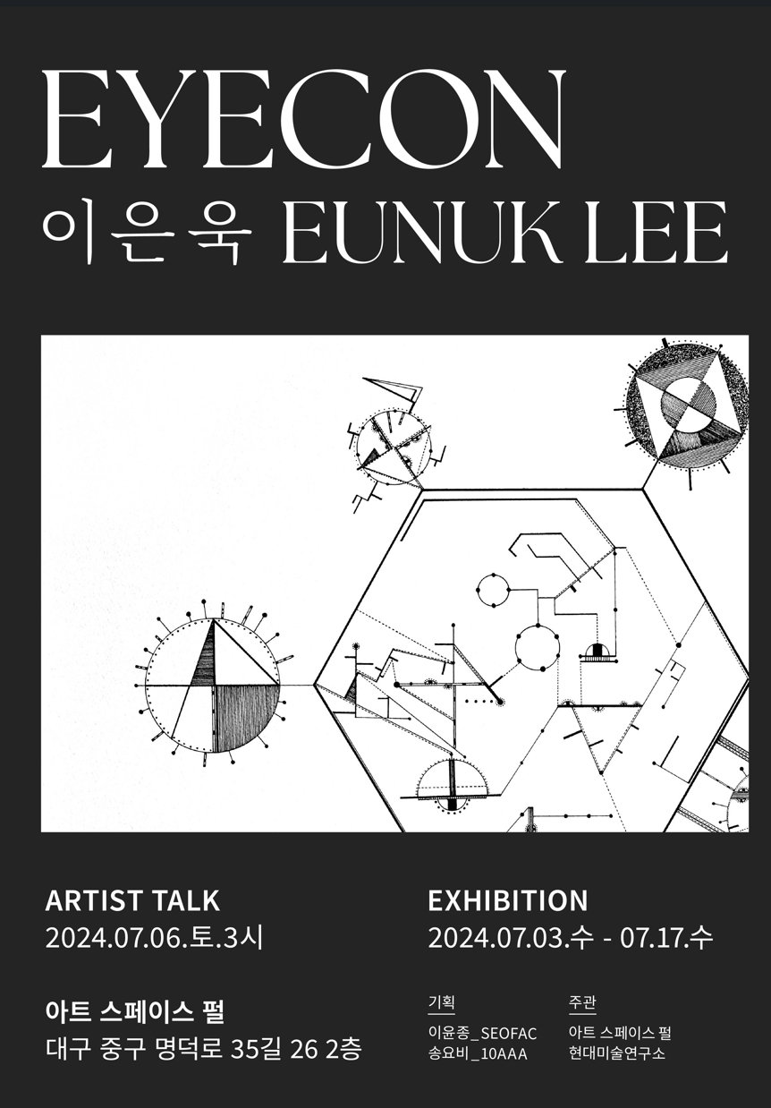 일시:2024년7월3일(수)-7월17일(수) 장소:아트스페이스펄(대구중구남산동명덕로35길26,2층) 아티스트토크:2024년7월6일토요일오후3시 기획:이윤종(SEOFAC),송요비(10AAA) 주관:현대미술연구소(CAI),아트스페이스펄(ArtSpacePurl) EYECON: 눈_세상을 만나는 창으로써의 신체/ 그리고 ‘I’를 대신하는 ‘Eye’ (송요비/디렉터, 10AAA) 전시 제목으로 선택한 아이콘(eyecon)은 시대의 우상을 의미하는 아이콘(icon)과 같은 발음을 가지지만 다른 의미로 사용한 작가가 단어 조합으로 만든 단어이다. 내면의 세계를 영상으로 작업한 초기 영상 ‘아이콘 (EYECON), 2006’은 작가의 작품 세계의 시작이 되는 작품으로 사전에 존재하는 아이콘(icon)_(특정한 사상·생활 방식 등의 상징으로 여겨지는) 우상과는 다르게 세상을 바라보는 창인 눈(EYE)을 통해 작품에 자신(I)의 생각을 담아내고자 하는 의미로 사용하였다. 이후 작가의 드로잉 작품에 가늘고 다양한 선들의 조합으로 구성된 화면에도 눈의 형태가 숨겨져 있듯이 곳곳에 그려졌다. 화면의 삼각형, 원, 그리고 가로지르는 직선들은 우주의 건축적 구조와 수학 패턴을 통해 특정 형태를 완성해 간다. 종이와 캔버스위의 선들은 작가의 출생 년도를 의미하는 ‘숫자 81‘ ,’눈(EYE)’과 ‘자아(EGO)’라는 글자들과 눈을 그린 도상들 모두 작가인 ‘나(I)’를 지시한다. 또한 드로잉 화면 위 검은 선의 움직임은 매번 새로운 형태와 함께 복잡한 선의 미로 형상으로 나타난다. 예술- 생각 에너지의 순환 ‘개인적인 것이 일반적인 것이다’라고 했던 릭 루빈(2023)은 예술이 생각 에너지의 순환이라고 하였다. 에너지는 매번 다른 방식으로 결합해서 돌아오기에 새로워 보이기에 세상에는 똑같은 구름은 없다는 것이다. 처음 접하는 예술 작품이 깊은 차원의 울림을 줄 수 있는 것도 이 때문이라고 하였다. 그는 익숙한 무언가가 그저 낯선 형태로 돌아온 것이기에 깨닫지 못할 뿐, 그것이 우리가 찾고 있던 무언가일 수도 있다고 한다. 절대로 끝나지 않는 퍼즐의 마지막 한 조각 같은 아이디어를 현실로 바꾸면 훨씬 작아 보이고 세상의 것이 아니었지만 세상의 것이 되게 된다고 하였다. 이은욱의 알고리즘 드로잉을 보면서 이 말이 떠오른 것은 우연일까? 작가가 화면 위에 만들어낸 에너지의 선들이 마치 설명을 초월하는 훨씬 거대한 무언가, 즉 무한한 가능성으로 가득한 세계의 일부처럼 눈앞에 다가온다.