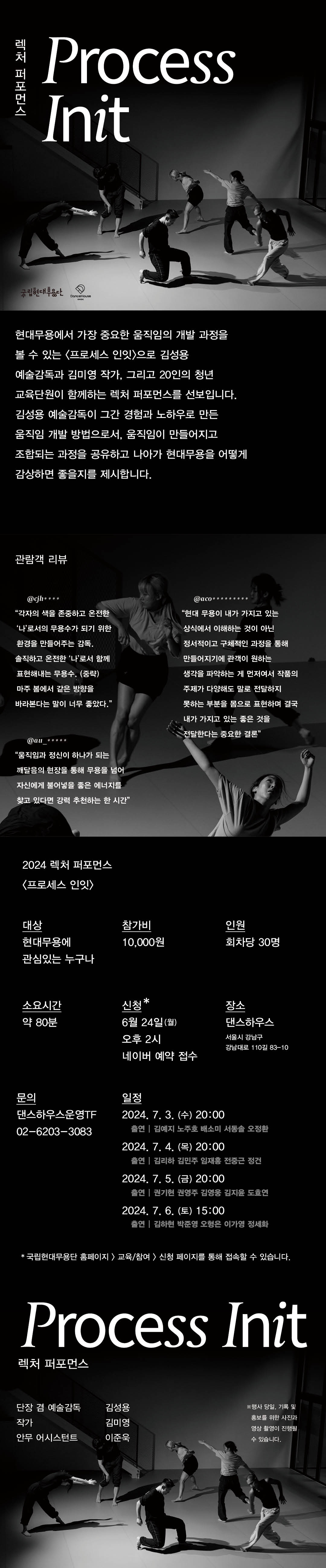렉처 퍼포먼스 <프로세스 인잇> ✅모집대상: 현대무용에 관심있는 누구나 ✅모집인원: 회차당 30명 ✅참가비: 10,000원 ✅일정: 7.3(수)~7.6(토) *평일 20:00 / 주말 15:00 ✅장소: 댄스하우스 ✅소요시간: 약 80분 ✅접수방법: 6.24(월) 14:00 네이버 예약 접수