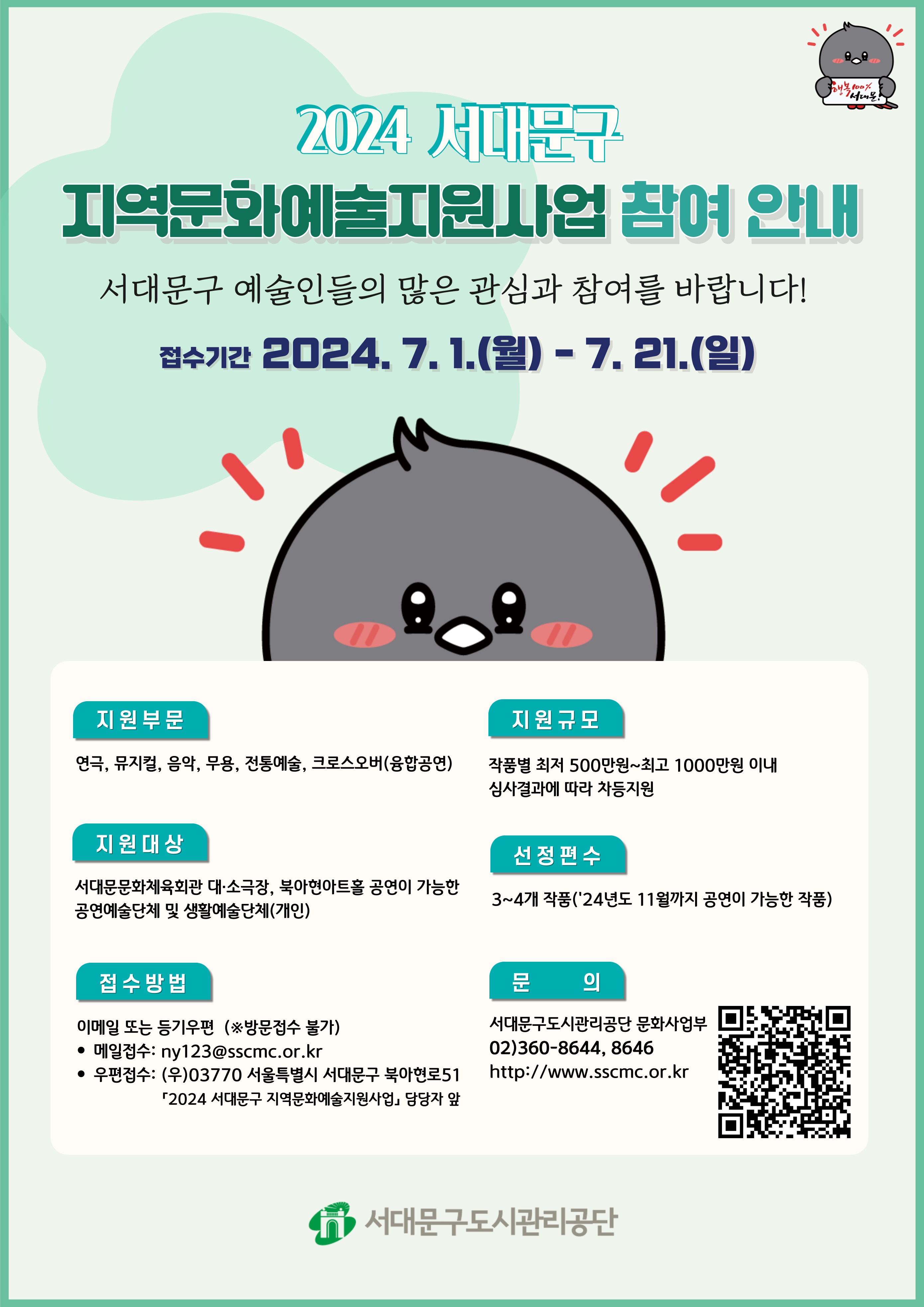 ■ 공모개요 1. 사 업 명: 2024 서대문구 지역문화예술지원사업 2. 공모기간: 2024.7.1.(월)~2024.7.21.(일)〔21일간〕 3. 공모부문: 연극, 뮤지컬, 음악, 무용, 전통예술, 대중음악, 크로스오버 등(융합공연) 4. 공모대상: 대·소극장·아트홀 공연이 가능한 공연예술단체 및 생활예술단체(개인) 5. 선정편수: 3~4개 작품(‘24년도 11월까지 공연이 가능한 작품) 6. 지원규모: 30,000천원(최저 5,000천원~최고 10,000천원) 7. 추진절차: 신청서 접수→공연계획서 심사(협의)→선정결과 공고 8. 교부방식: 사업종료 후 실비지급(심의지원금) ※ 자세한 내용은 공단 홈페이지 참고 바랍니다. 서대문구도시관리공단 홈페이지 > 알림마당 > 공지사항 https://www.sscmc..kr/bbs/board.php?bo_table=notice&wr_id=3446