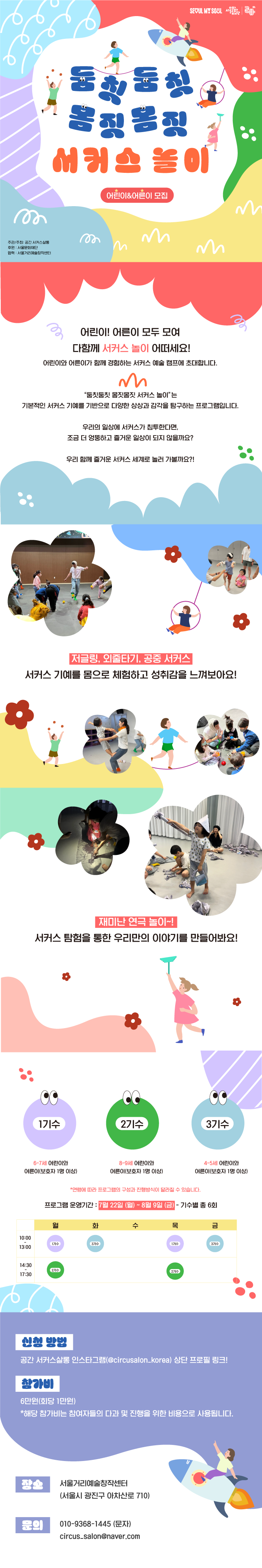 주최주관 | 공간 서커스살롱 후원 | 서울문화재단 협력 | 서울거리예술창작센터 문의 | 010-9368-1445 (문자), circus_salon@naver.com