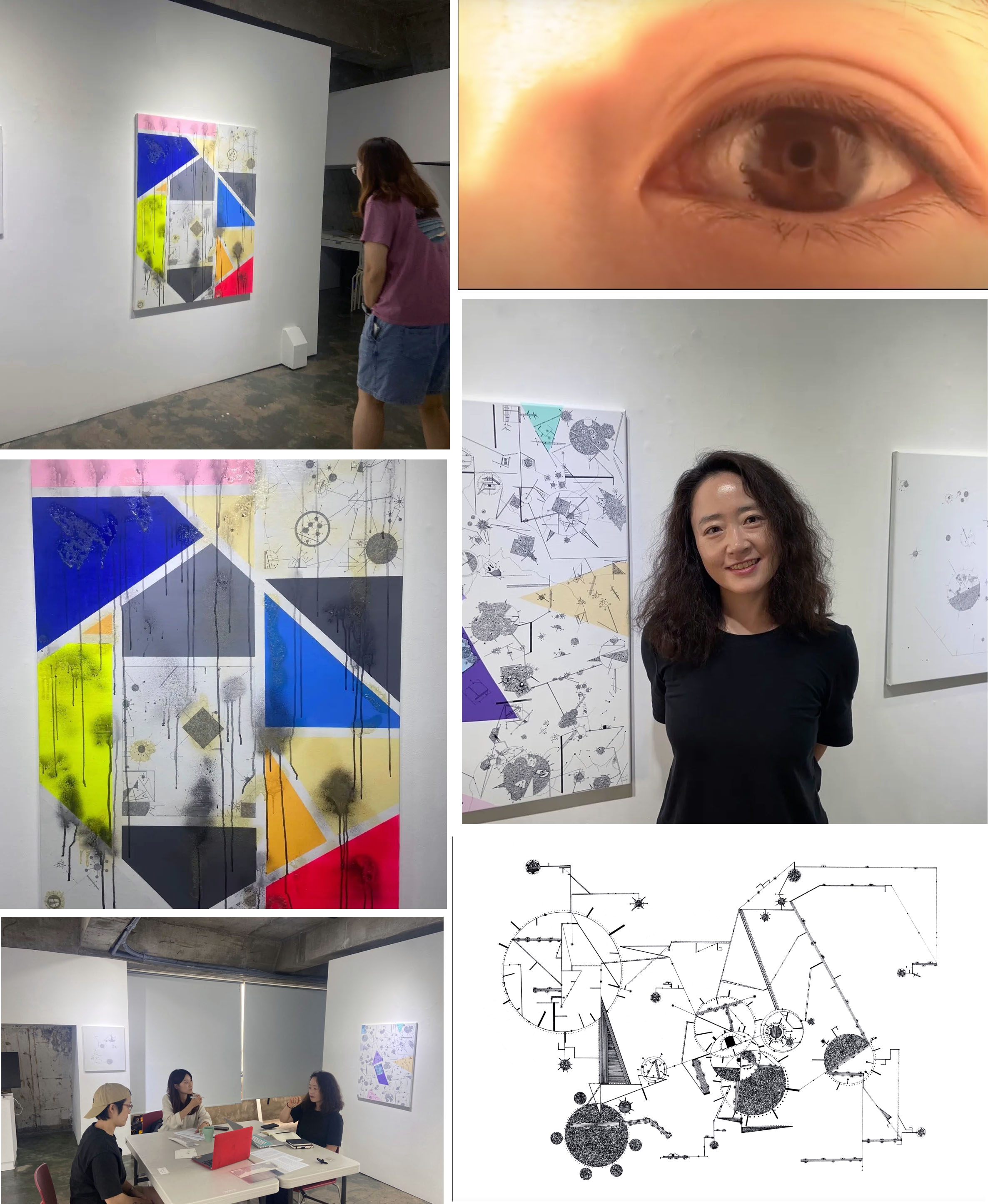 이후 작가의 드로잉 작품에 가늘고 다양한 선들의 조합으로 구성된 화면에도 눈의 형태가 숨겨져 있듯이 곳곳에 그려졌다. 화면의 삼각형, 원, 그리고 가로지르는 직선들은 우주의 건축적 구조와 수학 패턴을 통해 특정 형태를 완성해 간다. 종이와 캔버스위의 선들은 작가의 출생 년도를 의미하는 ‘숫자 81‘ ,’눈(EYE)’과 ‘자아(EGO)’라는 글자들과 눈을 그린 도상들 모두 작가인 ‘나(I)’를 지시한다. 또한 드로잉 화면 위 검은 선의 움직임은 매번 새로운 형태와 함께 복잡한 선의 미로 형상으로 나타난다.