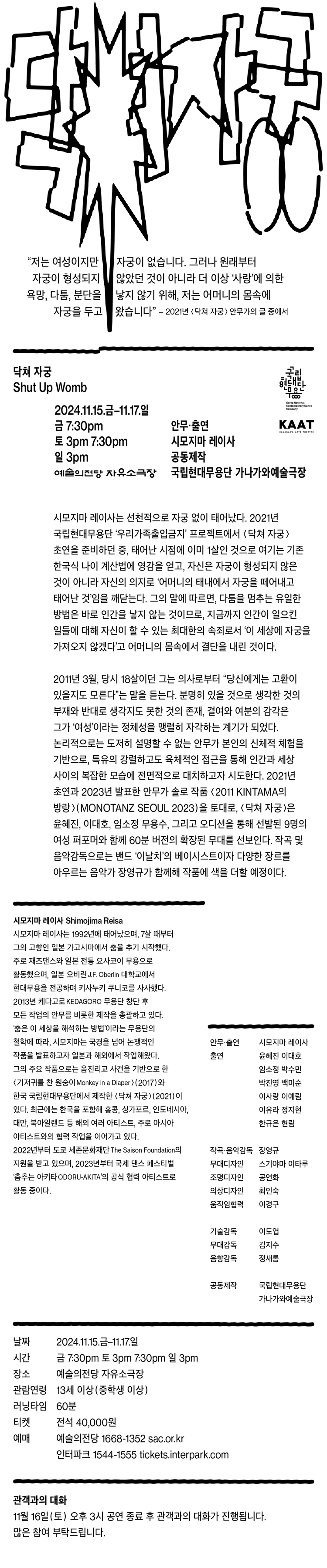 국립현대무용단 화제작! 시모지마 레이사 안무 <닥쳐 자궁> 11.15-17 예술의전당 자유소극장