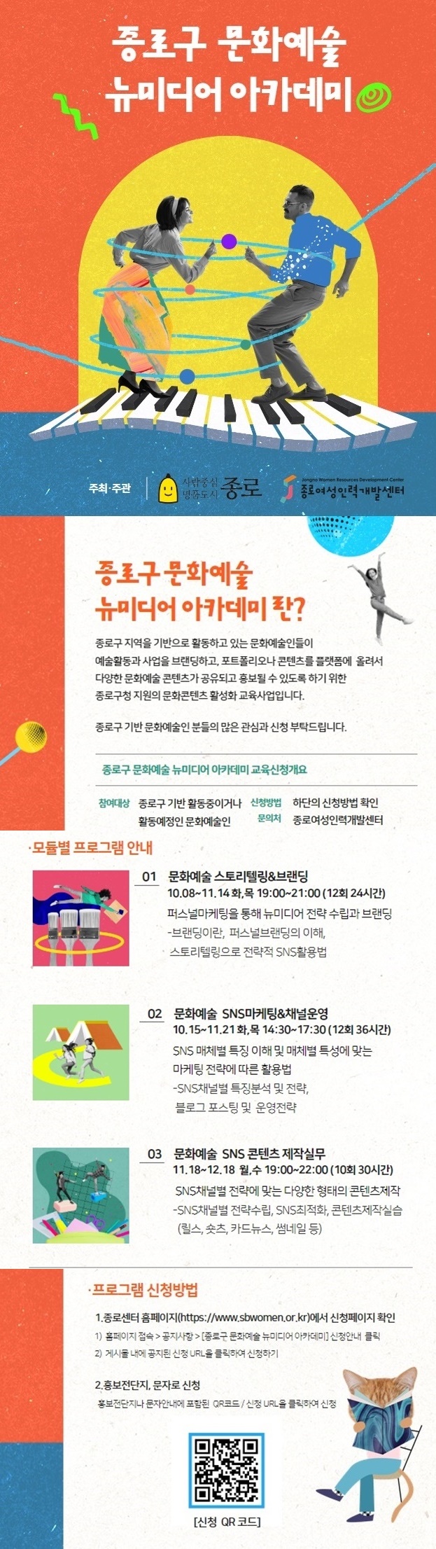 이번에 종로구청 지원으로 종로구 기반으로 활동하고 계신 문화예술인 (공연,전시,축제,행사,기획,문화교육 등) 을 대상으로 뉴미디어 SNS활용을 위한 아카데미를 진행합니다.