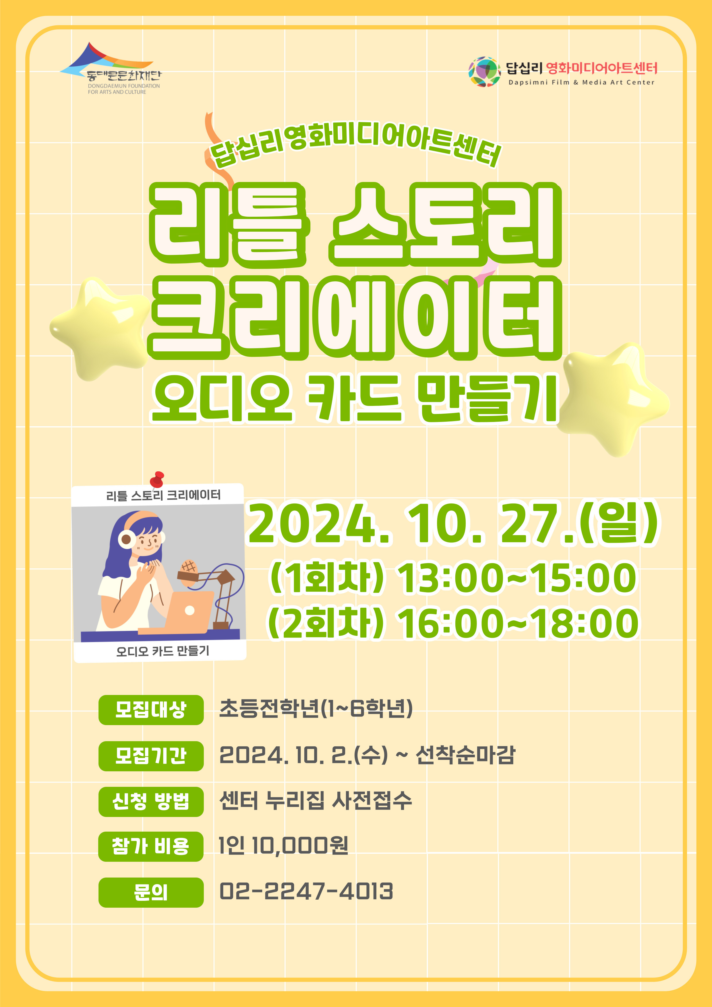 - 모집기간: 2024.10.2. ~ 선착순마감 - 교육일시: 2024.10.27.(일) (1회차) 13:00~15:00 (2회차) 16:00~18:00 - 압정: 모집대상: 초등 전학년(1~6학년) - 모집인원: 수업 당 15인 - 수강료: 1인 10,000원 - 신청방법 : 센터 누리집 온라인신청 - 문의사항: 02-2247-4013