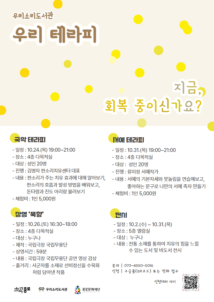 [국악 테라피] 일 정 : 10.24.(목) 19:00~21:00 장 소 : 4층 다목적실 대 상 : 성인 20명 진 행 : 김명자 판소리치유센터 대표 내 용 : 판소리가 주는 치유 효과에 대해 알아보기, 판소리의 호흡과 발성 방법을 배워보고, 돈타령과 진도 아리랑 불러보기 체험비 : 1인 5,000원